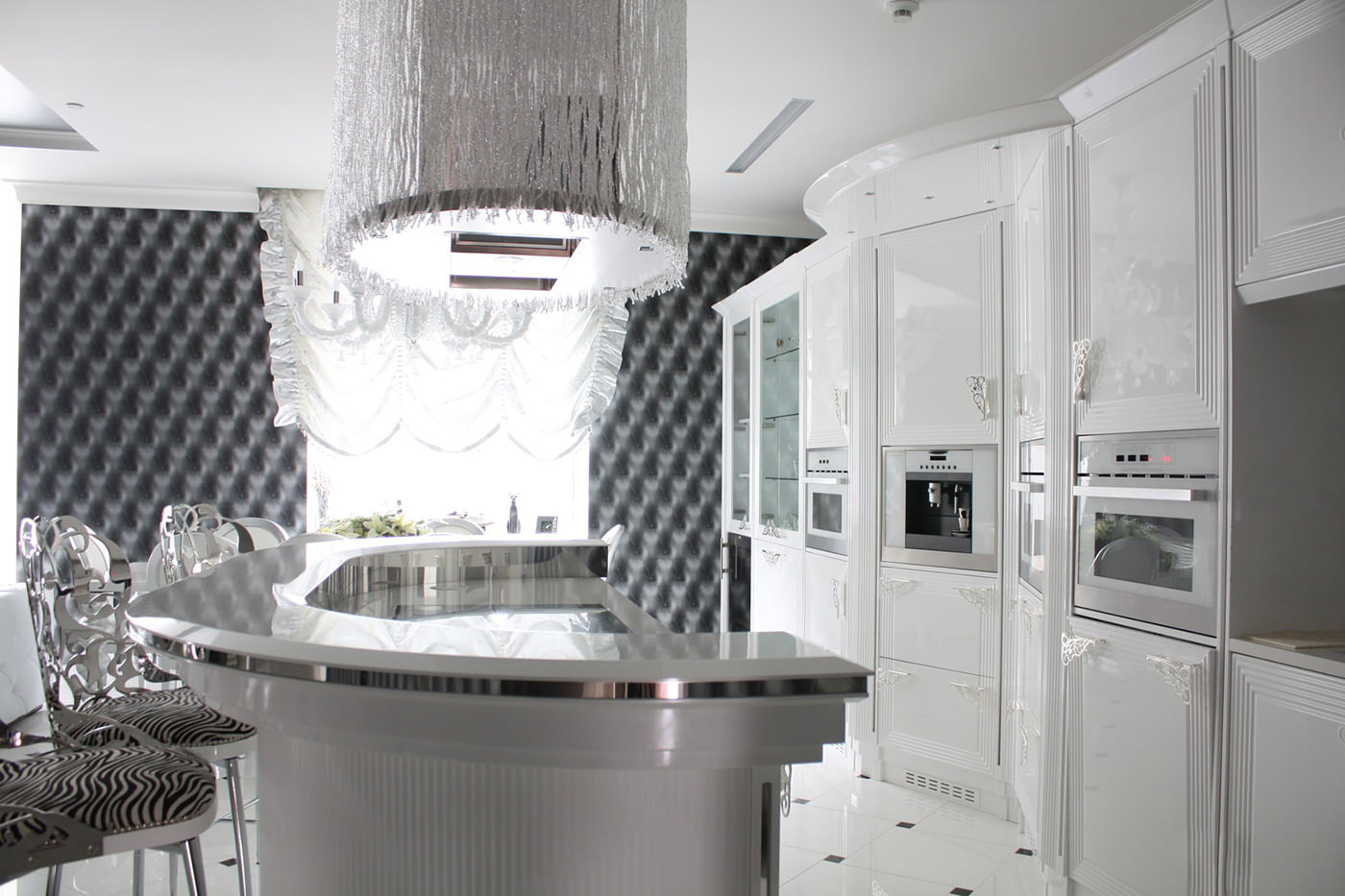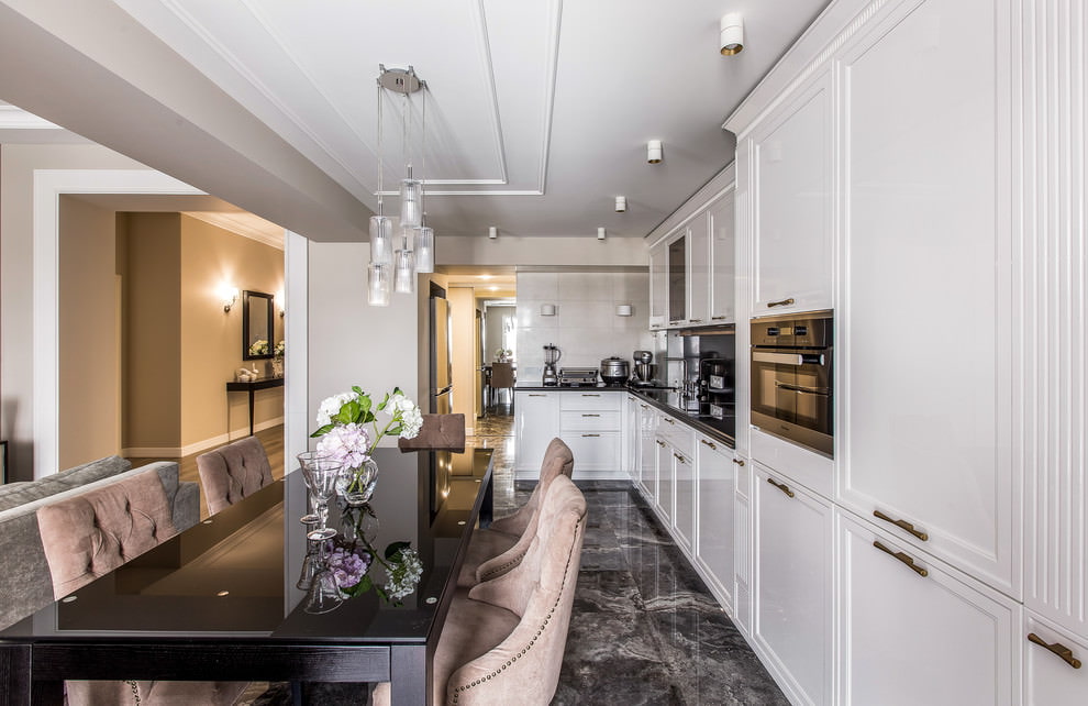 La nuance cristalline est différente dans les intérieurs avec une certaine reliure de style. Le classicisme et l'empire sont si souvent utilisés à l'intérieur de la cuisine, mais c'est une véritable ode à la couleur blanche, qui ne fait que souligner le rapport des proportions et la beauté des lignes simples. D'autres styles historiques, dont la Renaissance, le baroque et le rococo, reposent sur des tons laiteux et nacrés.