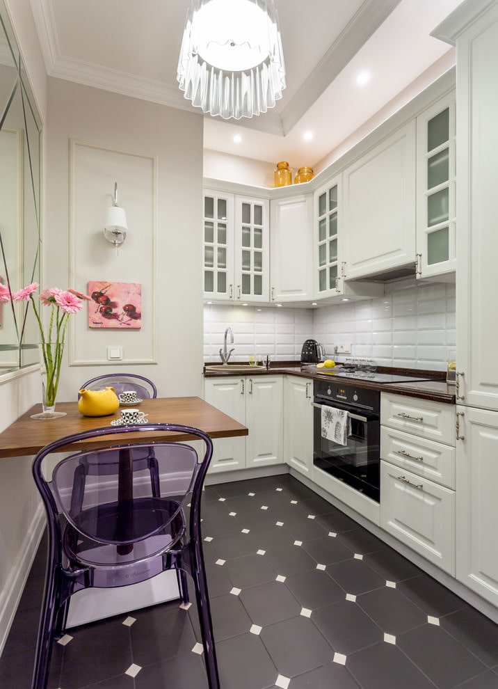 - tandem noir et blanc pour les amateurs de combinaisons contrastées, la cuisine a l'air strictement et correctement, surtout si, principalement, un dessus et un fond légers sont à l'origine bordés de carreaux noirs et blancs;