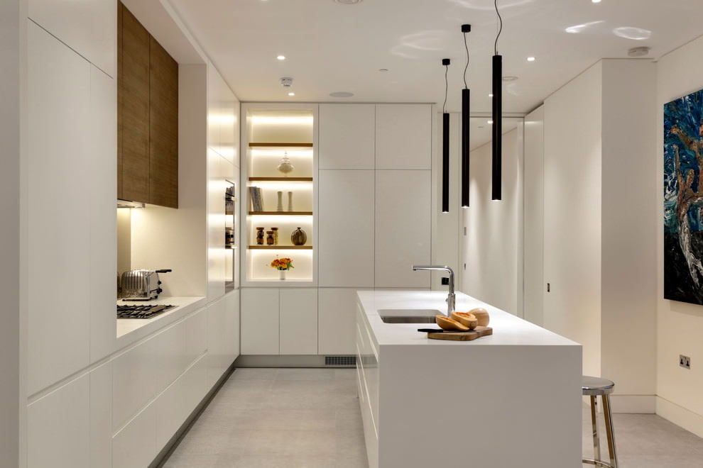 - attenante au hall d'entrée est une cuisine blanc brillant dans un style moderne.