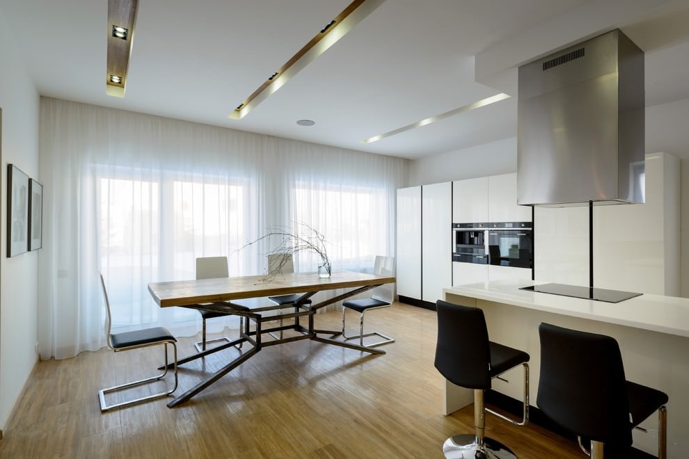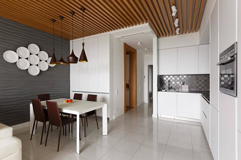 - Aujourd'hui, le plafond est souvent tendu, surtout lorsqu'il s'agit d'une cuisine blanche brillante dans un style moderne. Dans une petite pièce, il s'avère sans couture, ressemble à un miroir. Il existe de nombreuses autres solutions qui repoussent visuellement les limites de la pièce, mais celle-ci est considérée comme la plus efficace. Certains préfèrent le tissu satiné ou mat, la décoration en bois ou les poutres ne semble pas moins intéressantes, surtout si c'est un style country ou rétro.