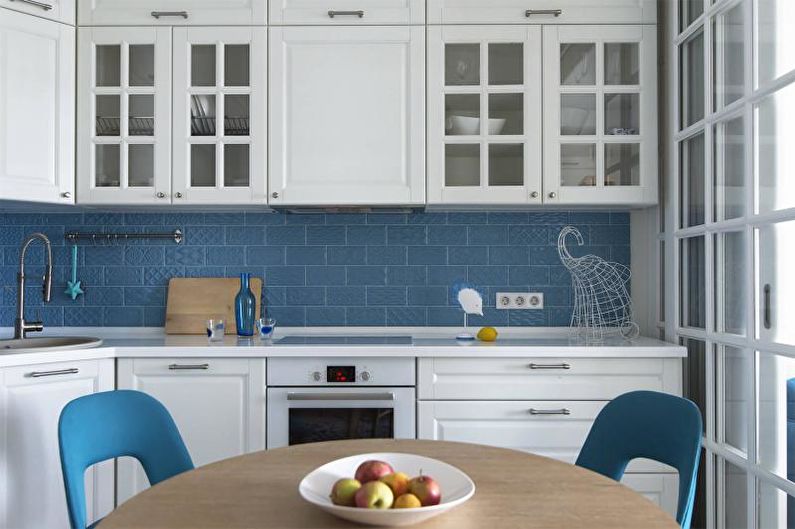 - bleu foncé et blanc - le "classique" russe de l'intérieur, qui rappelle un Gjel et un jouet Dymkovo, où rien n'a besoin d'être inventé, il reste à ajouter de tels plats à la salle de cuisine et à l'arrivée des invités;