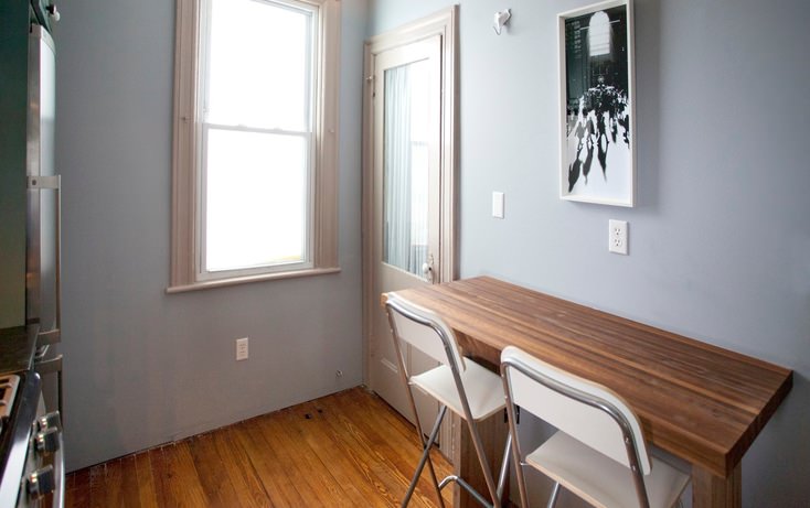 Dans la cuisine, la plupart des murs peuvent être simplement nivelés et peints dans une couleur calme.