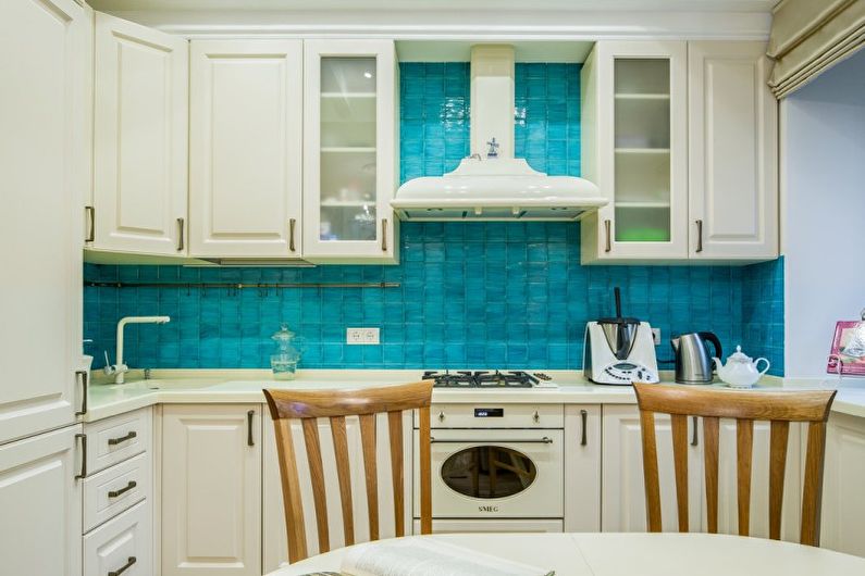 Une autre option pour utiliser la turquoise dans un intérieur moderne est l'utilisation de carreaux de céramique turquoise sur le tablier de la surface de travail. Il est important d'observer la règle suivante - pas de motifs floraux ou de dentelle sur la surface de la céramique. Le seul ornement qui peut être appliqué est des éléments géométriques, qui ne s'expriment pas à cause de la couleur, mais à cause de la texture. C'est-à-dire, par exemple, que des pois mats ou des lignes de la même couleur sont appliqués sur une tuile turquoise brillante.