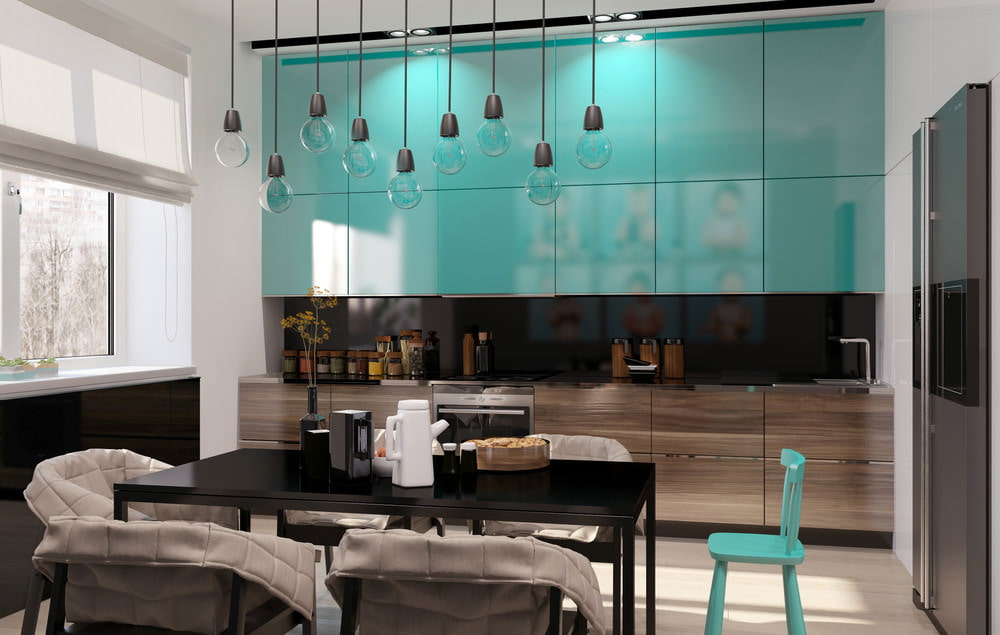 Si un ensemble de cuisine turquoise est choisi pour un intérieur moderne, il est préférable de préférer l'option dans laquelle les plans avant des armoires sont fabriqués en brillant et la couleur est aussi sombre et saturée que possible. Les sols, murs et plafonds les plus neutres, qui peuvent avoir des couleurs telles que:
