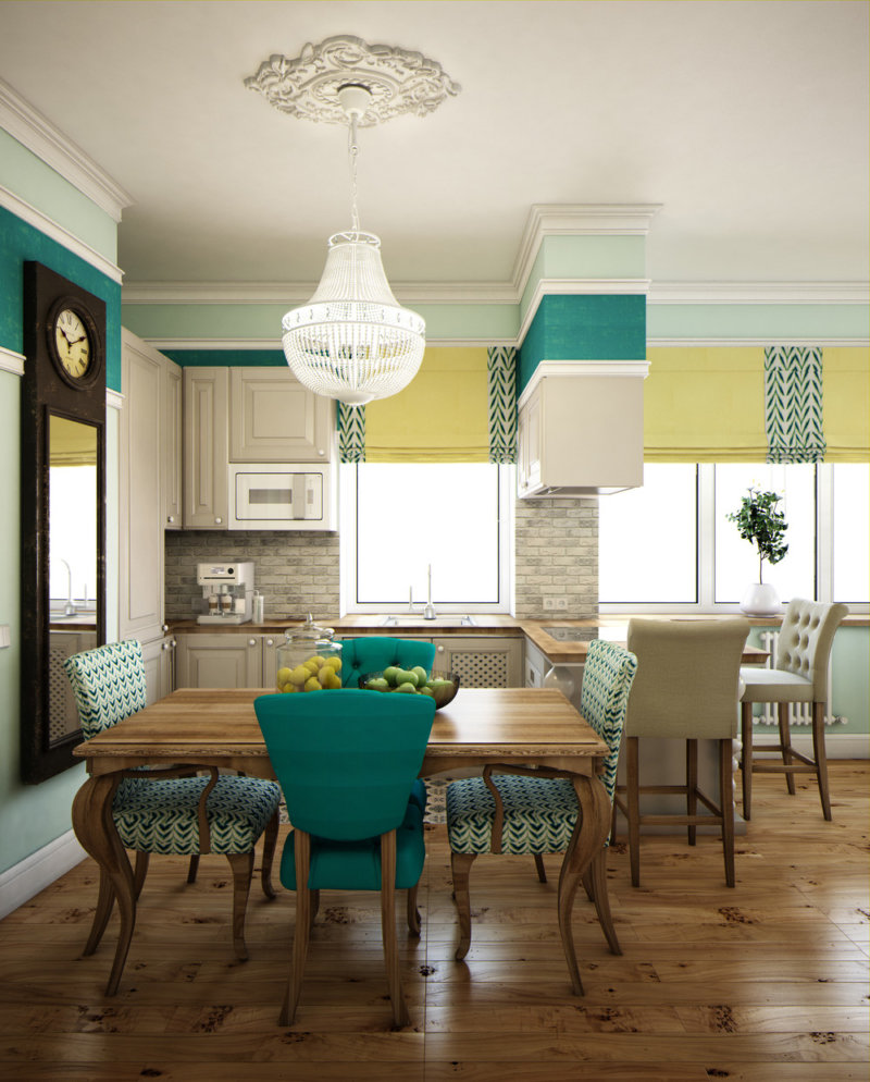 Il n'est pas souvent possible de trouver une couleur turquoise lors de la décoration de l'intérieur de la cuisine. Bien que ce ton puisse apporter fraîcheur et légèreté à l'espace de la pièce. En choisissant une couleur turquoise à l'intérieur de la cuisine, il convient de noter que les fenêtres doivent faire face au côté ensoleillé afin que la couleur bleu-vert ne semble pas trop froide. Si cela n'est pas possible, il est nécessaire d'utiliser des surfaces en bois ou un décor bronzage chaud comme éclaboussures de couleur.