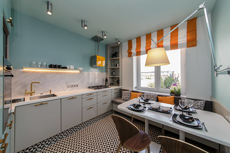 Pour que la turquoise ne devienne pas trop froide, vous devez choisir une couleur chaude pour l'éclairage de la cuisine.