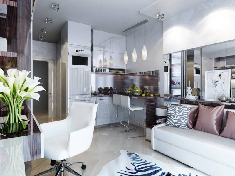 La règle principale dans le choix de l'intérieur reste l'incarnation d'une idée, d'un concept unique. La cuisine-salon doit être en harmonie avec le style général de l'appartement.