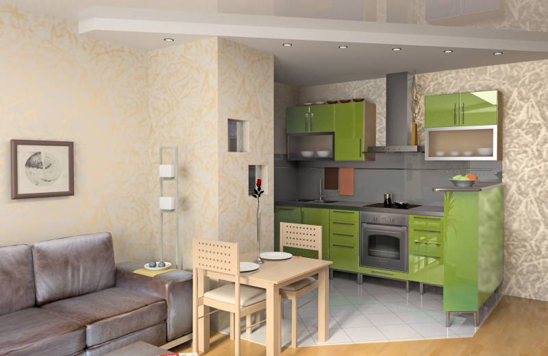 - L'intérieur de la cuisine-salon est de 14 mètres carrés. m. avec canapé