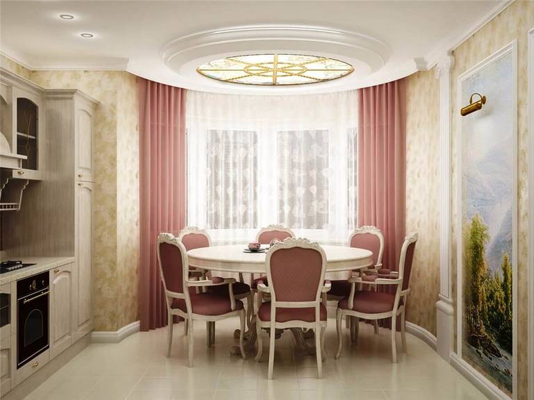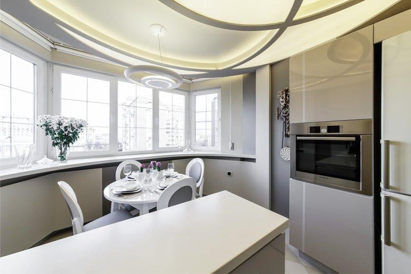 Le canapé en baie vitrée dispose également d'un espace de rangement supplémentaire. Selon la disposition, choisissez une forme semi-circulaire, carrée et droite. Une solution réussie pour cette disposition sera une porte coulissante - elle ne nécessite pas d'espace libre autour.