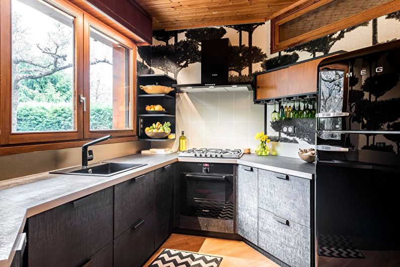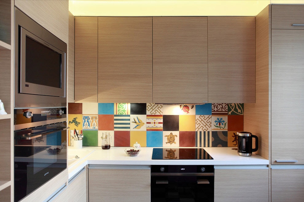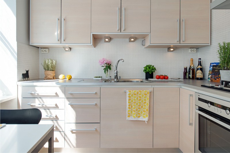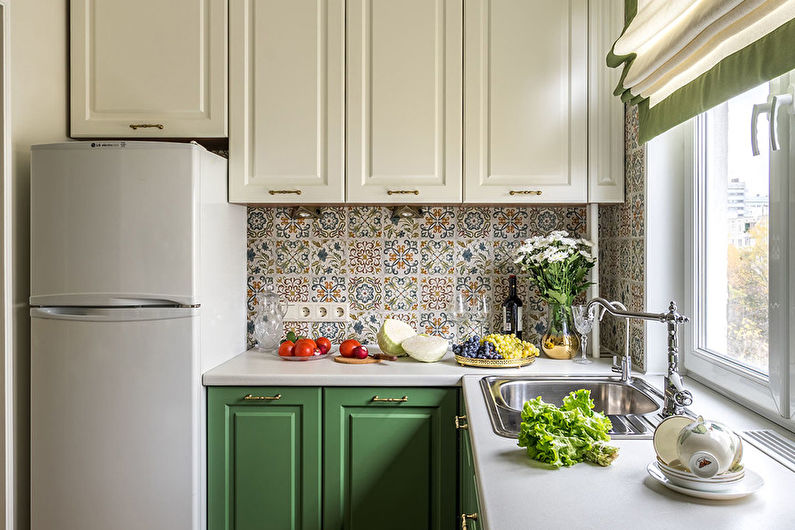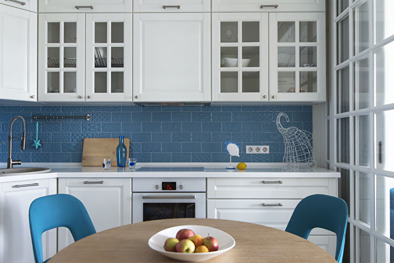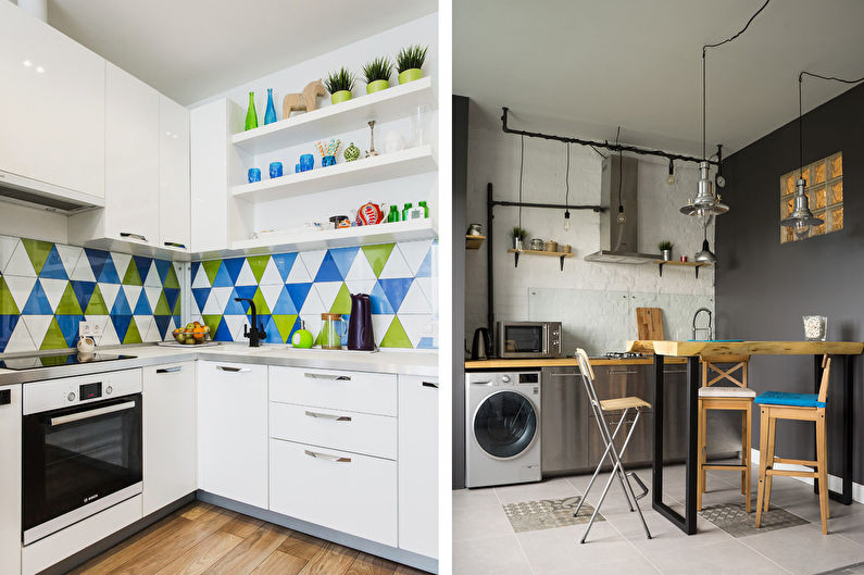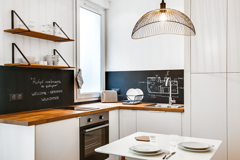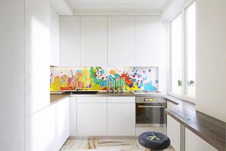 Étant donné que le coin cuisine est petit, pour terminer la cuisine, vous devez choisir des options qui peuvent agrandir visuellement l'espace. Par exemple, si les murs sont peints en blanc, la pièce deviendra plus claire et apparaîtra plus spacieuse.En outre, lors du choix des matériaux de finition, il convient de privilégier ceux qui ont un motif fin.