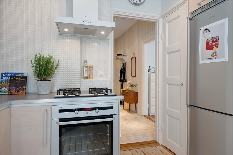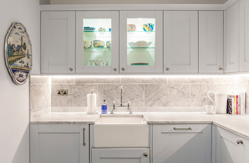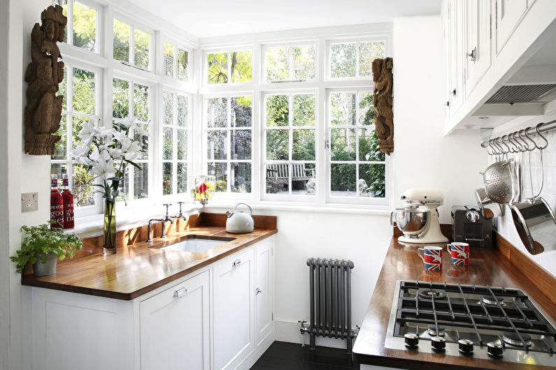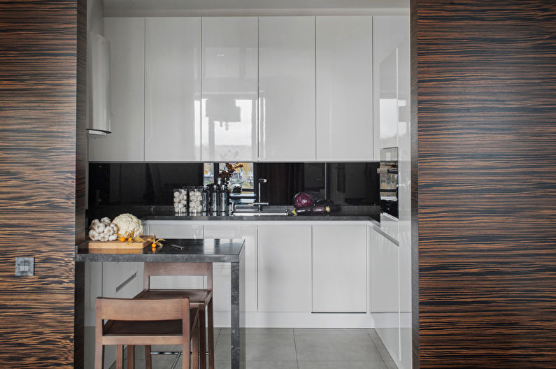 De plus, pour la conception de la cuisine en blanc, une teinte contrastée de mobilier ou un tablier convient bien. L'ensemble de cuisine dans ce cas semblera plus petit et comme encastré dans le mur.
