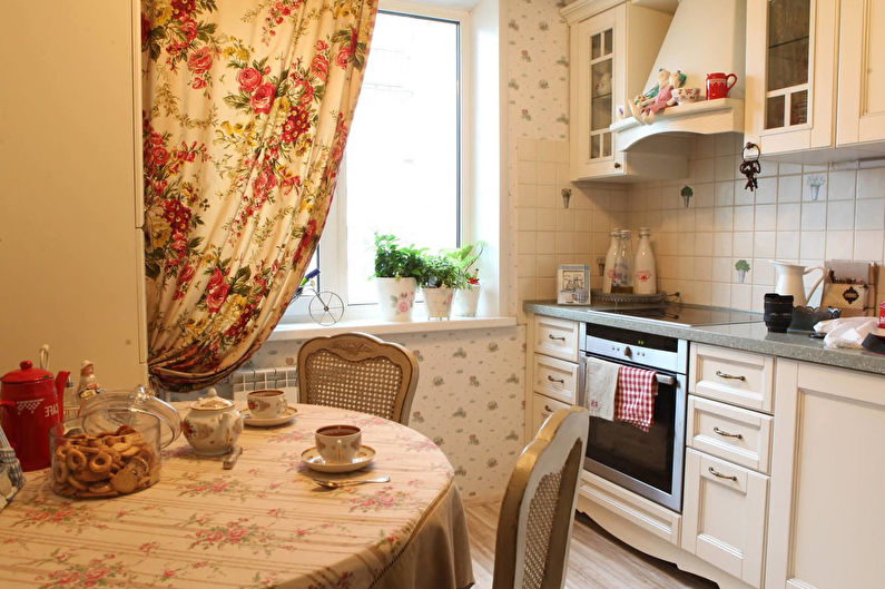 Lorsque vous concevez une cuisine, ne vous laissez pas trop emporter et vaporisez, car l'abondance de décor ne surchargera qu'une petite pièce. Deux ou trois décorations suffisent, soulignant les préférences des propriétaires et le style de la cuisine. Des textiles de cuisine correctement sélectionnés contribueront à compléter l'impression. Pour la décoration des fenêtres, des rideaux courts et plissés conviendront, les stores romains ou à enrouleur seront également beaux.