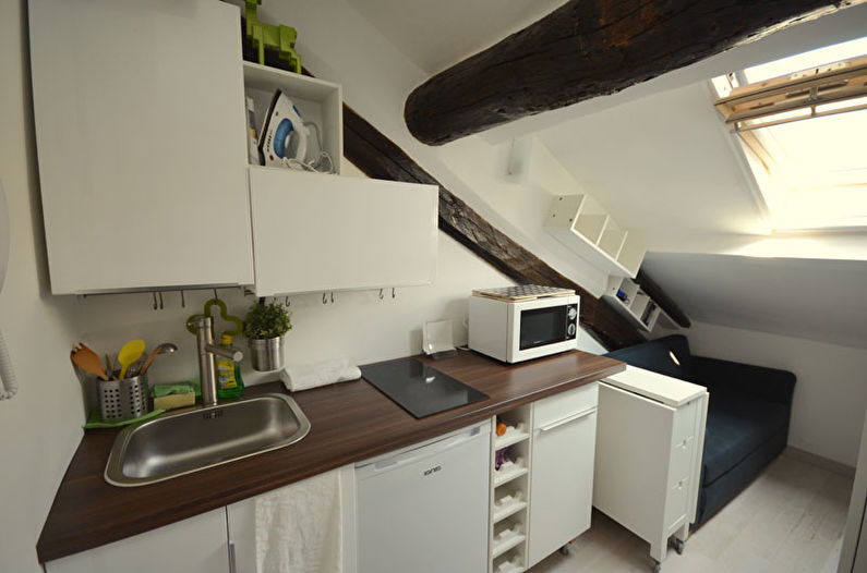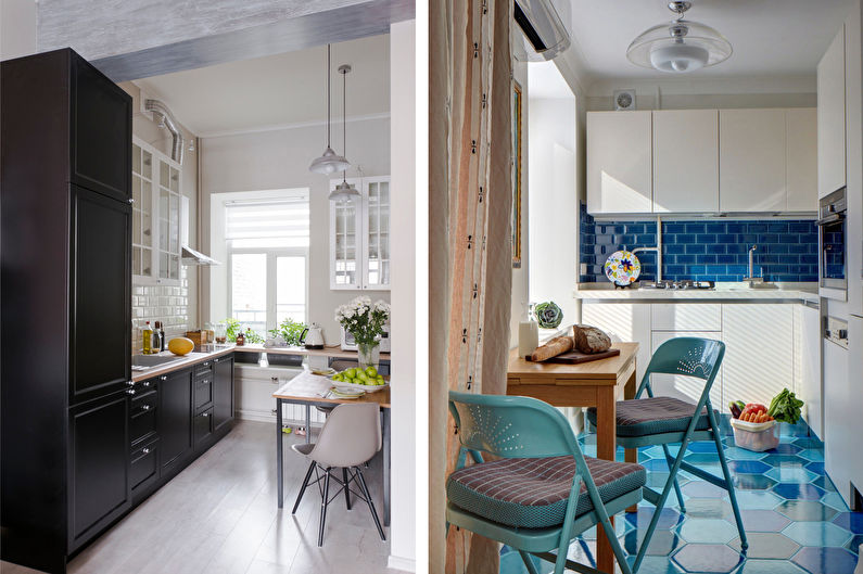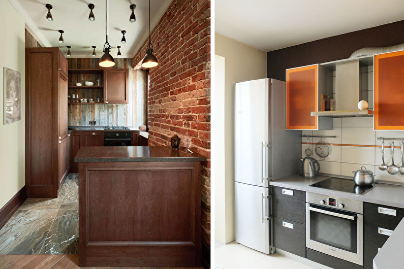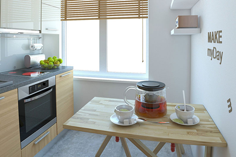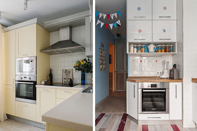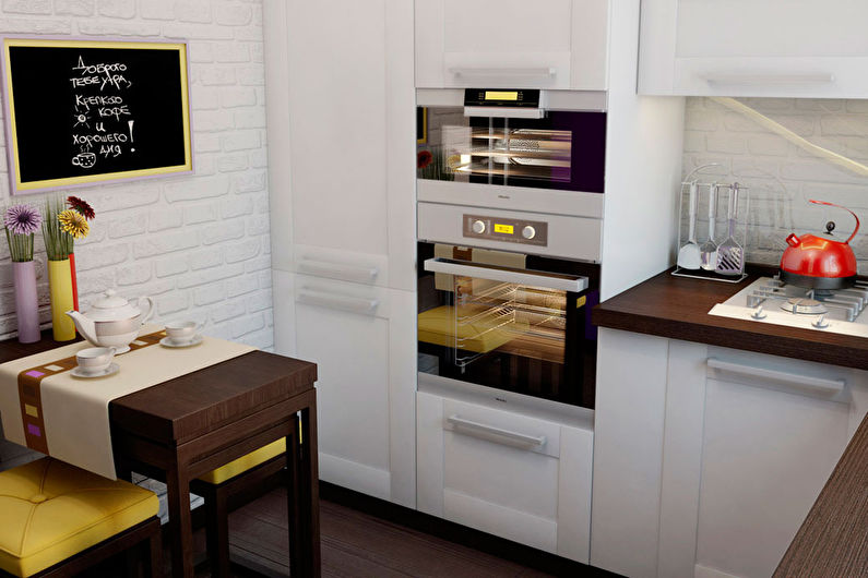 Avant d'acheter, il vaut la peine de revérifier le plan au centimètre, étant donné la petite taille de la pièce, il est très important de saisir toutes les dimensions. De plus, vous devez planifier le placement non seulement pour les gros équipements, tels qu'une cuisinière ou un lave-vaisselle, mais également pour un robot culinaire, une cafetière et d'autres petits aides de cuisine. Dans le même temps, il peut être plus rentable d'acheter un appareil multifonctionnel ou de le remplacer par une version plus compacte.