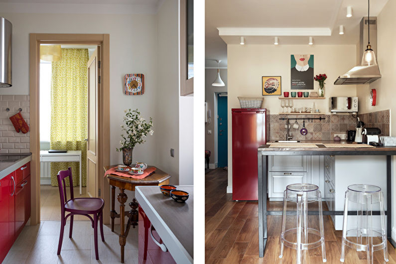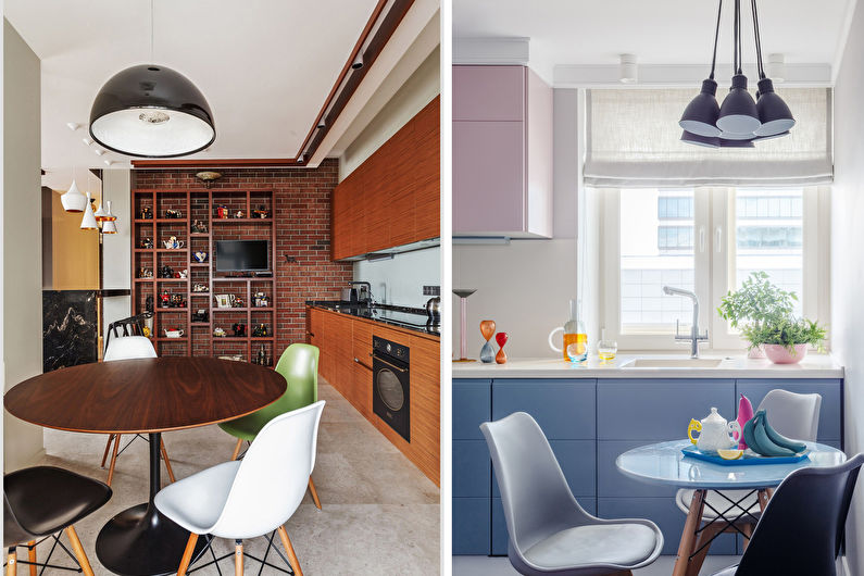 L'agencement de la salle à manger dépend directement du nombre de résidents et de leurs préférences. Pour deux personnes, une petite table transformateur pour deux est idéale, qui dans le cas des invités est aménagée et peut accueillir 4 personnes ou plus. Dans le cas où les déjeuners à domicile sont rares, une table basse pliante convient, vous pouvez également envisager l'option avec un comptoir de bar ou même convertir un rebord de fenêtre en dessous, ce qui économisera considérablement de l'espace.