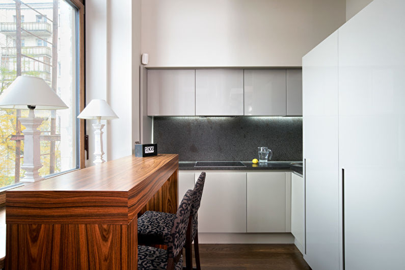 - Minimalisme Les formes simples, un minimum de décorations et les éléments intérieurs nécessaires sont idéaux pour les espaces limités. Le design est dominé par des teintes blanches et grises avec des éléments de chrome, de brillant et de miroirs.