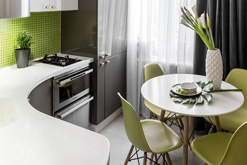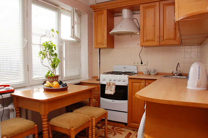 Il est préférable de choisir une table avec des coins arrondis - elle est plus compacte et est la mieux adaptée pour une petite cuisine, car les coins tranchants rendent difficile le déplacement dans un espace étroit et peuvent provoquer des blessures.