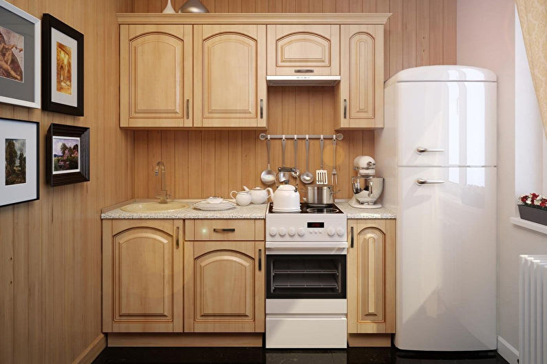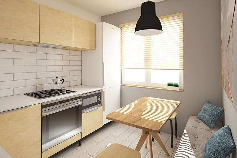 La plupart des cuisines font 7 mètres carrés. m. ont une forme carrée ou allongée. En raison de leur petite taille, le nombre d'options pour organiser les meubles et les appareils électroménagers est réduit.