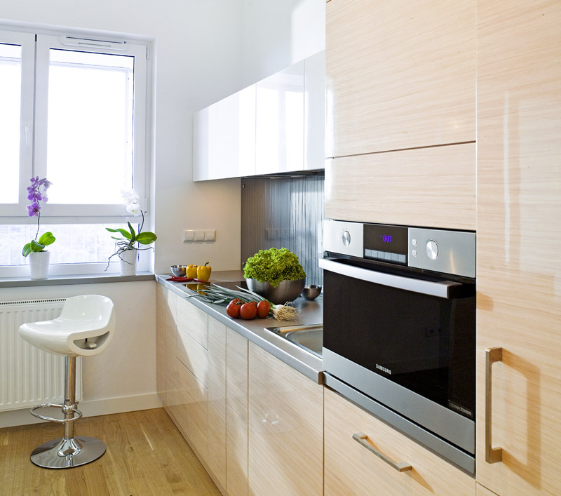 L'une des façons d'augmenter l'espace de la cuisine consiste à restructurer - déplacer le mur ou combiner avec la pièce voisine. Lors du déplacement du mur, l'isolation de la cuisine est conservée, ce qui empêche le bruit et l'odeur de la cuisson. Si la cuisine est combinée avec le salon, le volume des deux pièces augmente et il y a plus de liberté pour les décisions de conception.
