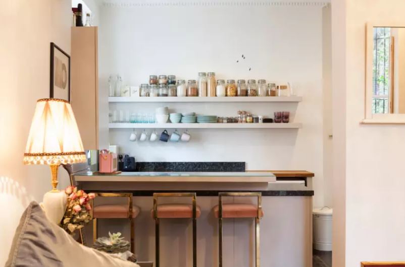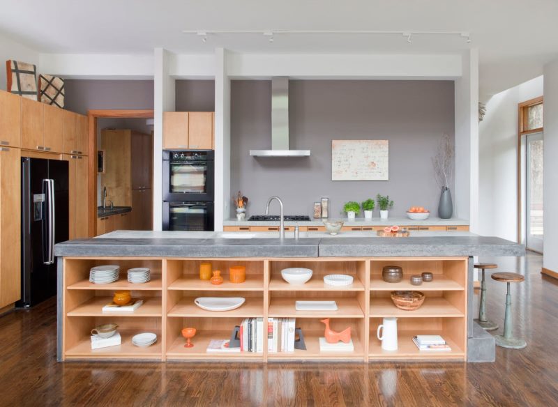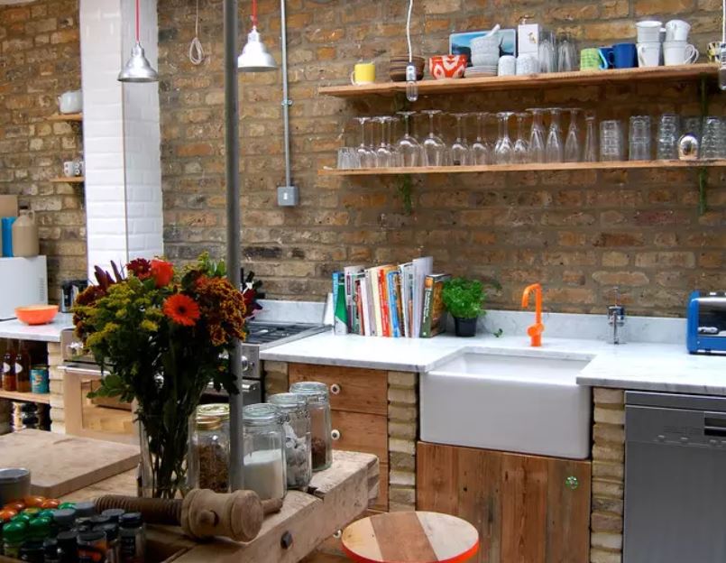 Cuisine éclectique avec de nombreuses étagères ouvertes