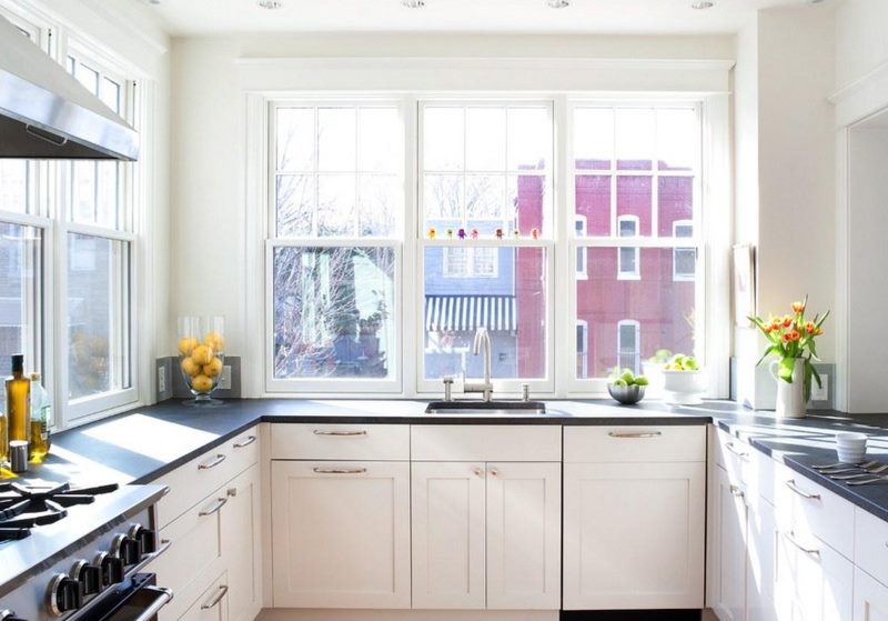 La disposition implique de placer le casque près de deux murs adjacents. L'ensemble d'angle est le plus approprié pour les petites cuisines, où vous souhaitez placer autant d'espace de travail que possible dans un petit carré. De plus, ce type de disposition se caractérise par l'emplacement proche de l'évier, de la cuisinière et du réfrigérateur, ce qui rend le travail plus confortable.