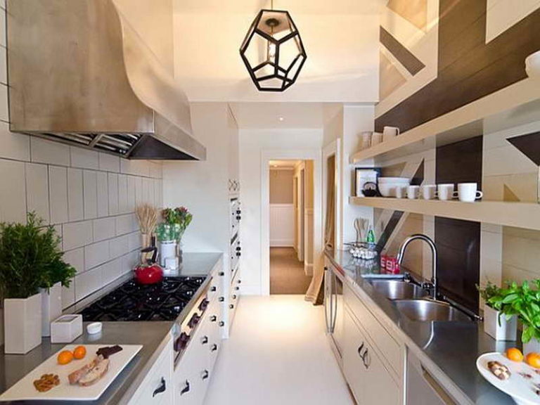 Cette option est similaire à l'option linéaire, la seule différence étant que la «ligne» n'en est pas une. Deux espaces de travail parallèles, constitués d'unités de cuisine ou d'armoires, sont à la base de cet aménagement. Il est tout à fait approprié d'utiliser à la fois dans des pièces assez étroites et grandes. Dans le premier cas, les "lignes" sont situées sur deux murs opposés, et dans le second un îlot de deux casques parallèles est situé au milieu de la pièce.