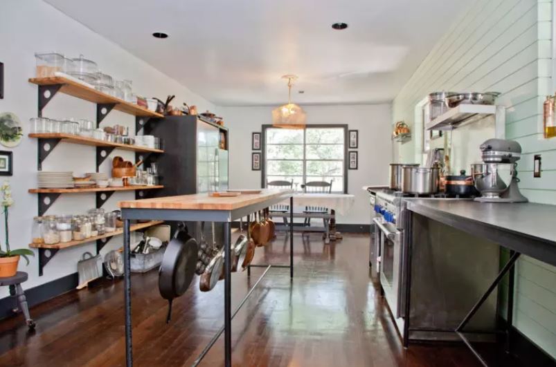Les étagères ouvertes en métal, les crochets et les rails de toit ont fière allure dans le grenier, et de beaux plats servent de décor lumineux