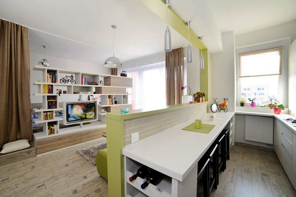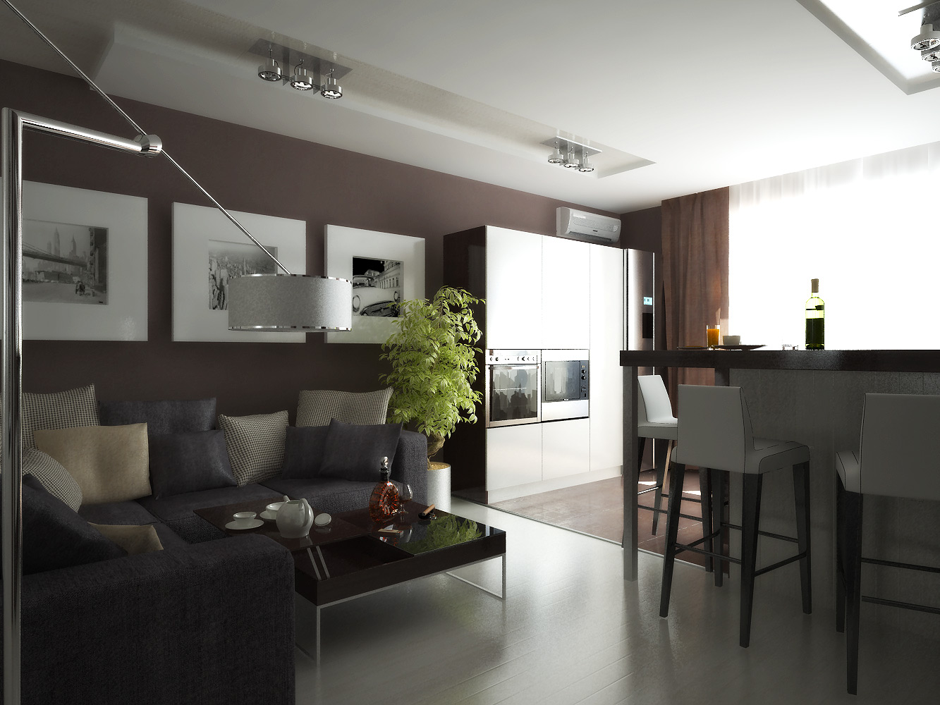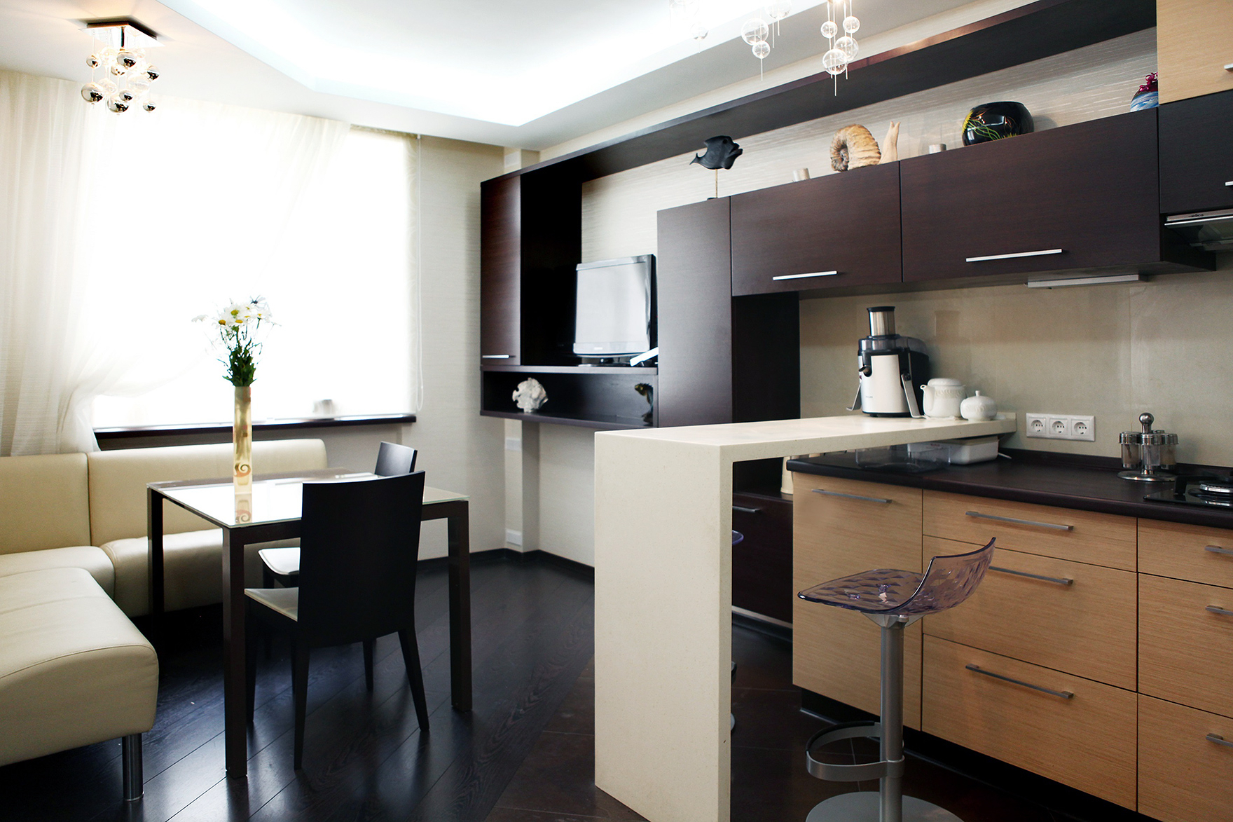 - Placement ergonomique et rationnel des meubles et électroménagers. Cela vous permet de vous déplacer facilement dans la pièce grâce à l'utilisation d'un petit nombre d'éléments nécessaires. Pour une utilisation confortable de l'espace, des modules multifonctionnels avec un comptoir de bar pliable et des chaises conviennent parfaitement. En outre, économiser la zone utile du salon aidera les plans de travail rétractables intégrés aux armoires de cuisine.