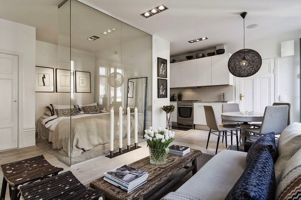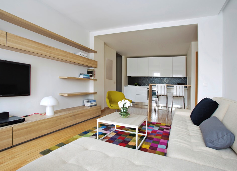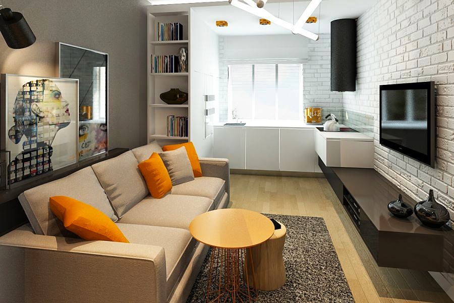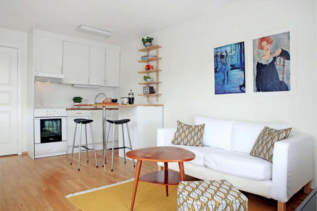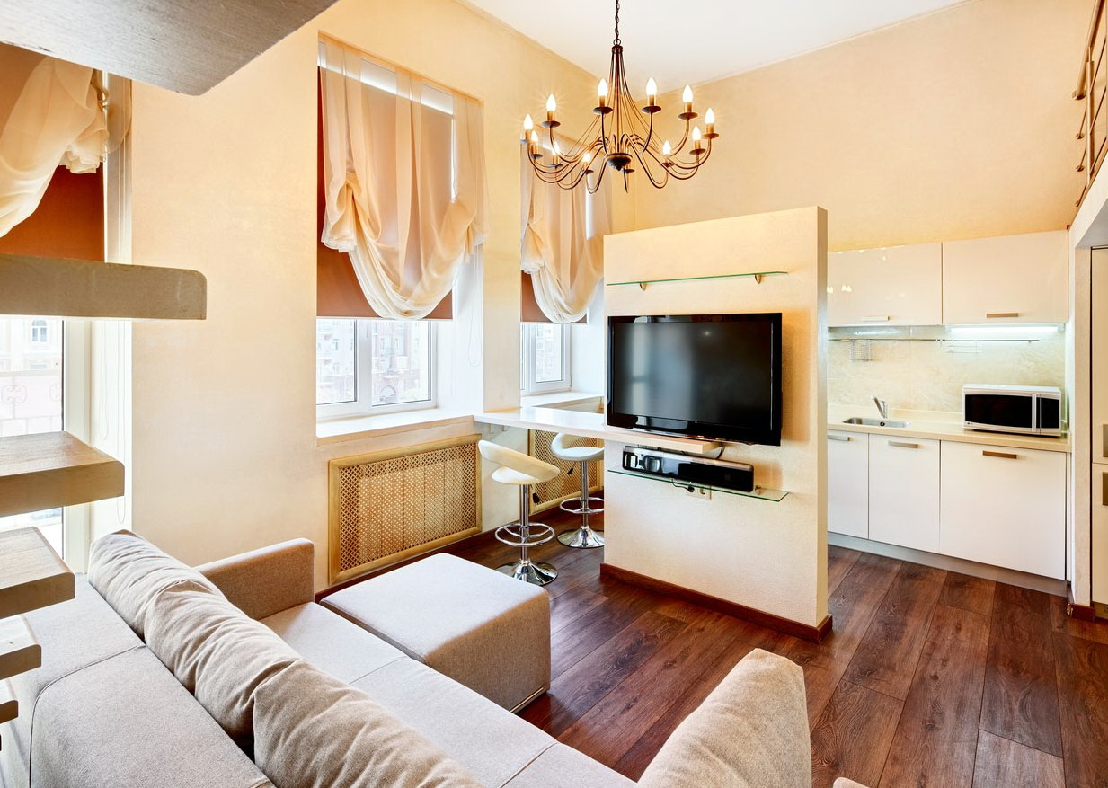 - Placement ergonomique et rationnel des meubles et électroménagers. Cela vous permet de vous déplacer facilement dans la pièce grâce à l'utilisation d'un petit nombre d'éléments nécessaires. Pour une utilisation confortable de l'espace, des modules multifonctionnels avec un comptoir de bar pliable et des chaises conviennent parfaitement. En outre, économiser la zone utile du salon aidera les plans de travail rétractables intégrés aux armoires de cuisine.