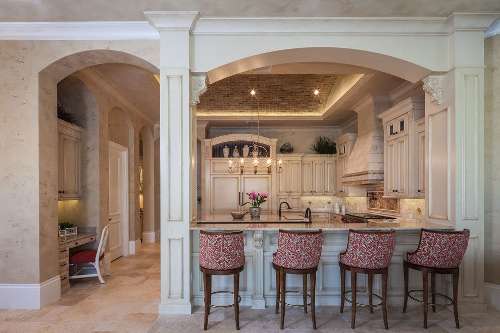 Pays, le style classique peut être créé en utilisant une variété de cloisons sèches. Ils se distinguent par une abondance de surfaces dorées et brillantes des comptoirs et des façades.