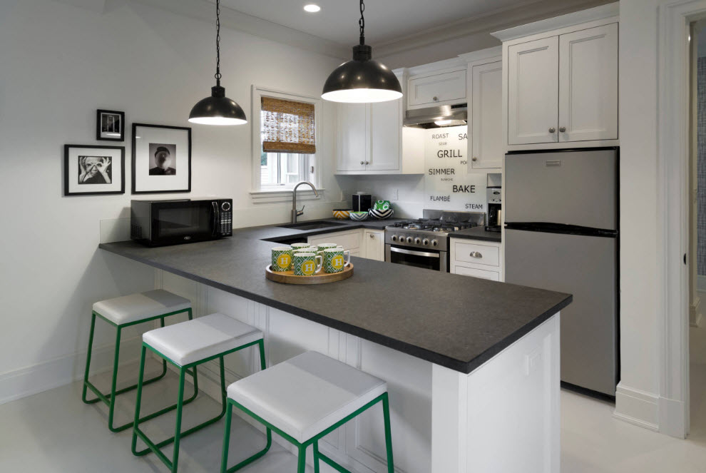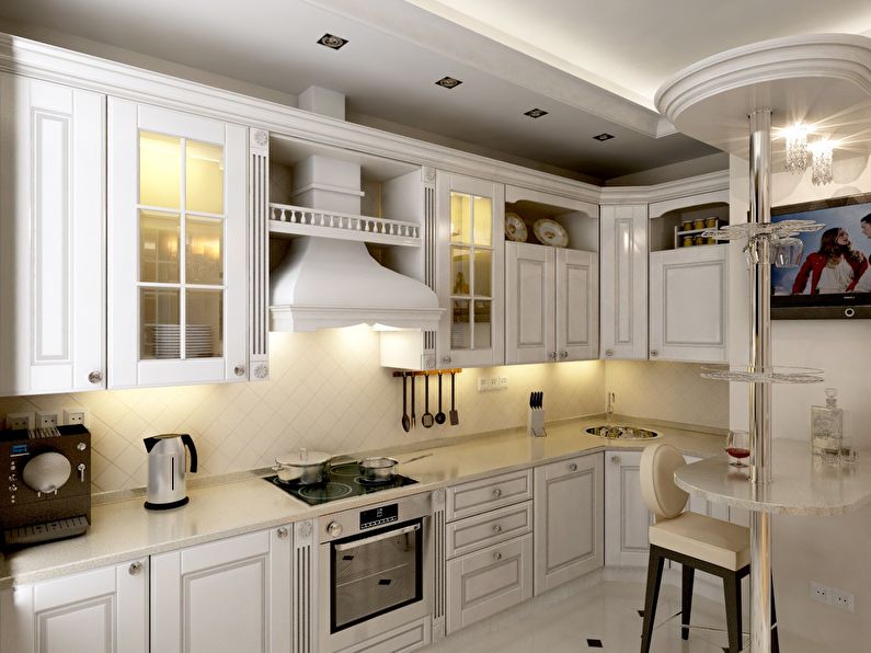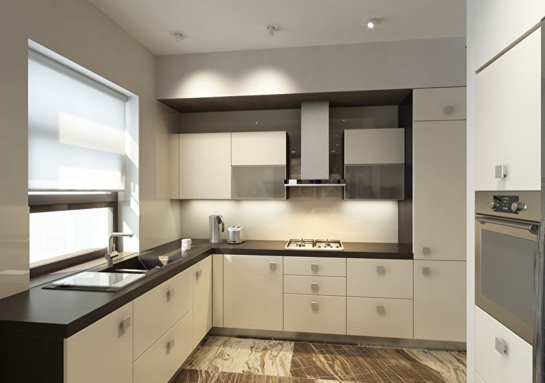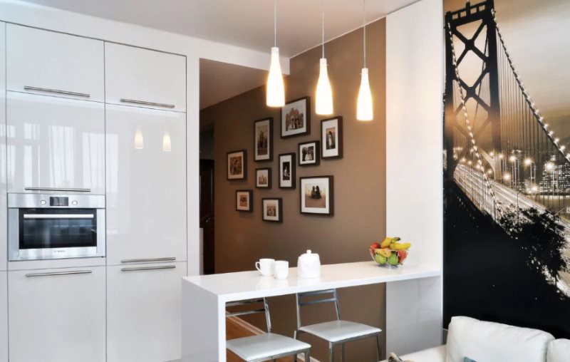 Une cuisine en U doit être choisie s'il y a un besoin de cuisiner pour une grande famille, alors une longue surface de travail sera utile. Le meilleur choix pour une petite cuisine serait une disposition directe ou en forme de L du casque. Il est permis d'utiliser un bar, il peut servir de salle à manger, alors qu'il peut être servi ou des aliments prétraités. Il faut se rappeler que la largeur minimale de la barre est d'environ 700-900 mm, sinon toutes les éclaboussures et les gouttes de nourriture tomberont sur le sol et les murs de la cuisine.
