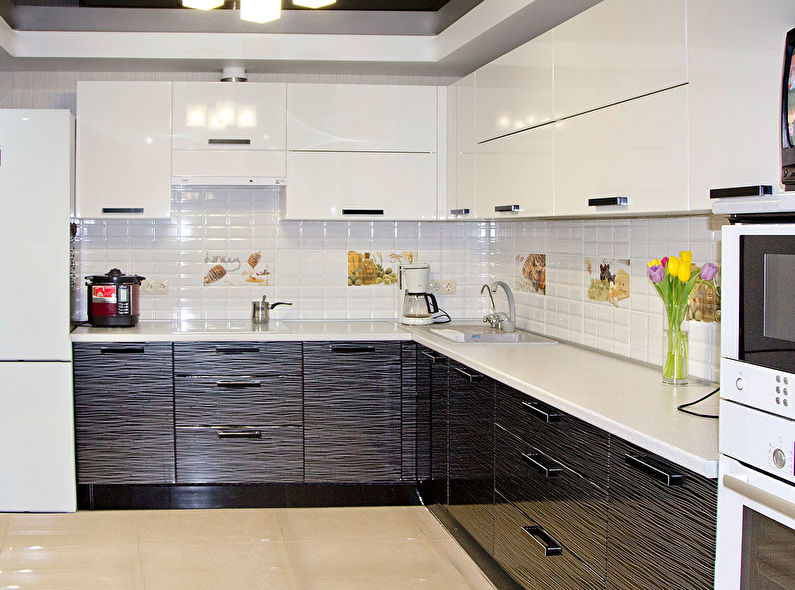 Les façades en relief d'un ensemble de cuisine peuvent causer beaucoup de problèmes à l'hôtesse. Parce que la saleté et la graisse se bouchent dans les creux de la texture. Les laver à partir de là est très difficile. C'est une mauvaise idée d'utiliser des carreaux de céramique au lieu de comptoirs en plastique, en bois, en pierre artificielle ou naturelle. Les joints entre les carreaux se salissent, les produits de peinture laissent des taches sur le coulis. Le revêtement des carreaux est moins cher, mais dangereux en termes de normes d'hygiène.