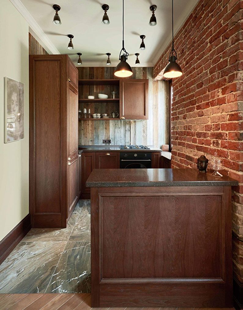 «Classiques du genre» - façades en bois marron sur fond de murs blancs. Toujours à la mode et éprouvée.