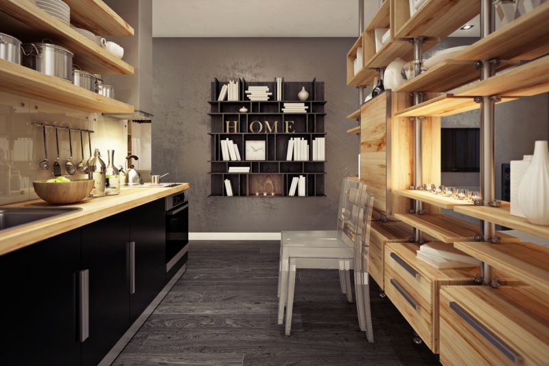 Lorsqu'il n'est pas possible d'utiliser des armoires à portes battantes, elles peuvent être remplacées par des étagères ouvertes. La poussière s'accumule plus rapidement dans ces endroits. Par conséquent, le nettoyage des étagères ouvertes devra être effectué beaucoup plus souvent. Il en va de même pour les miroirs, les surfaces brillantes de couleurs sombres et les textures de métal poli.