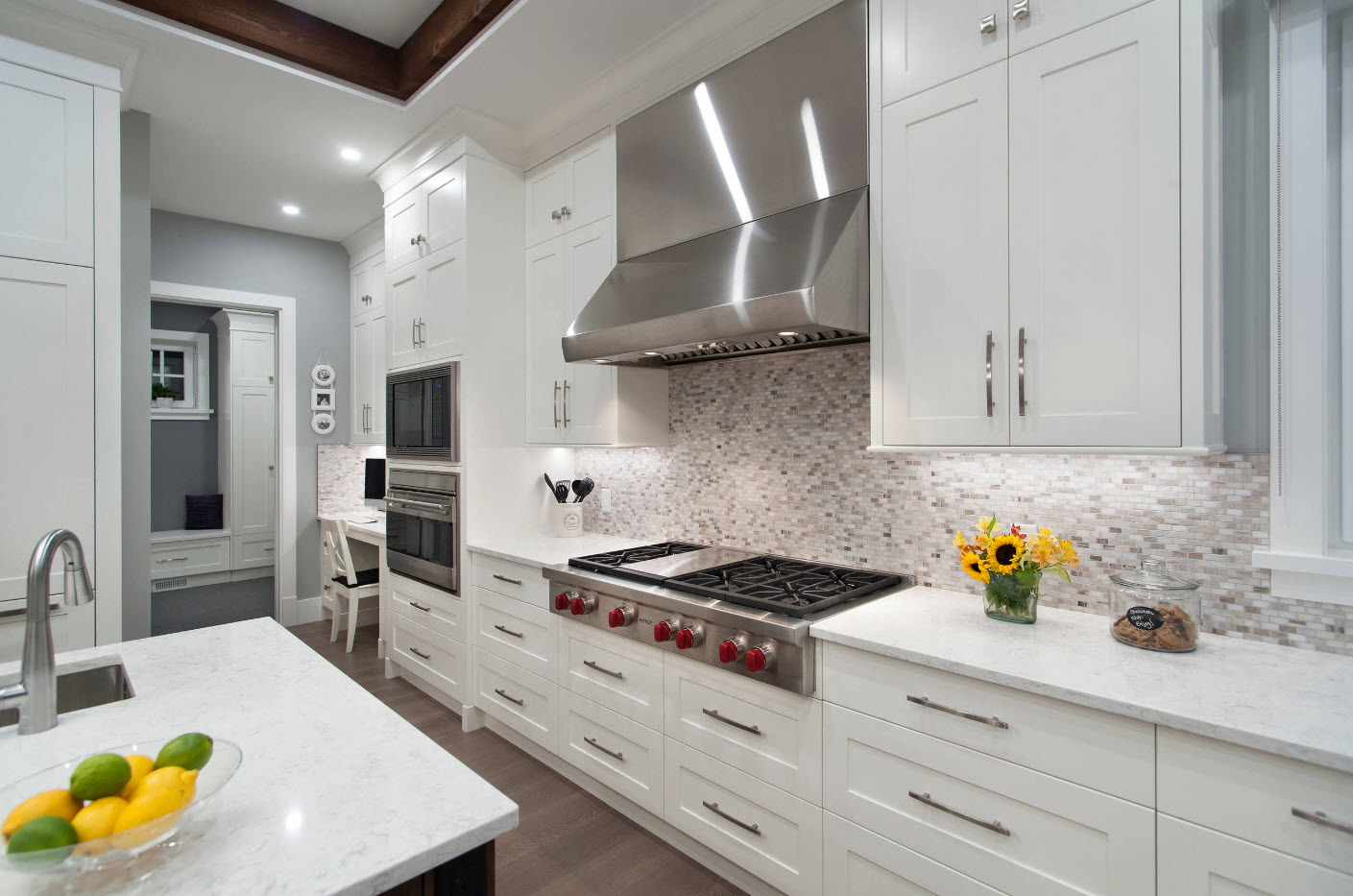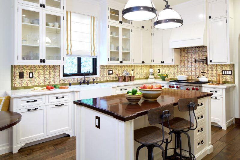 N'importe quel élément peut devenir un accent dans votre cuisine, qu'il s'agisse d'un tableau accroché au mur ou d'une forme inhabituelle d'horloge montrant le contraire. En outre, selon le style choisi, la disposition des fruits dans des paniers ou des bols en métal décorera la cuisine. Dans la partie insulaire de la cuisine peuvent être des livres, des plats en osier et des paniers avec des légumes. L'utilisation de carreaux multicolores ou de carreaux photo peut être un ajout original.