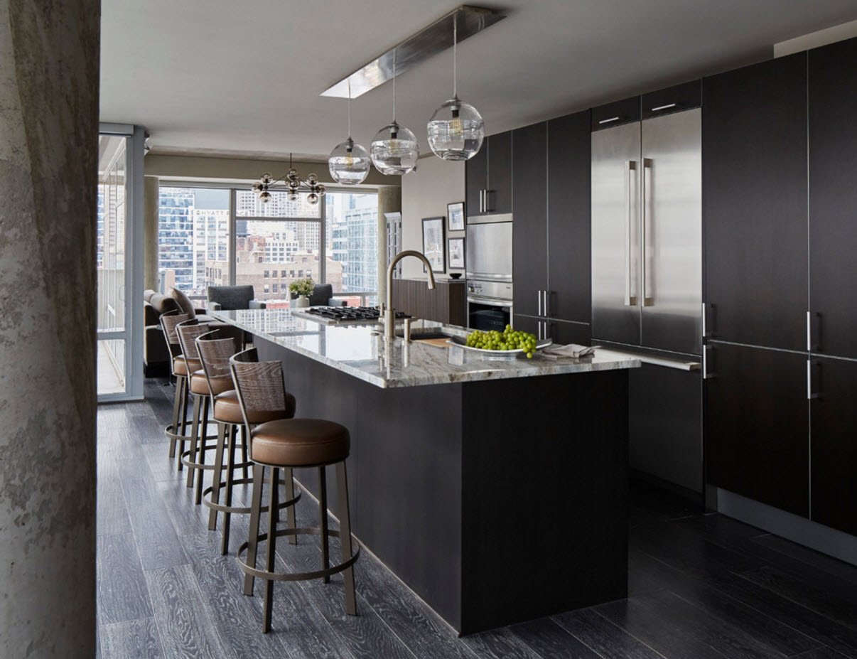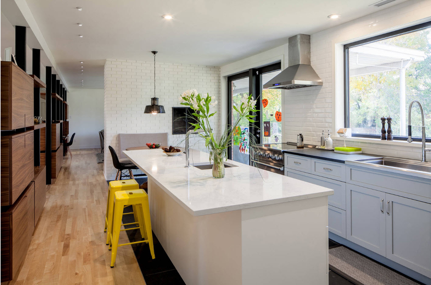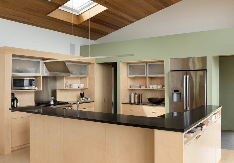 La disposition linéaire vous permet de placer une salle à manger confortable ou un îlot de cuisine à grande échelle