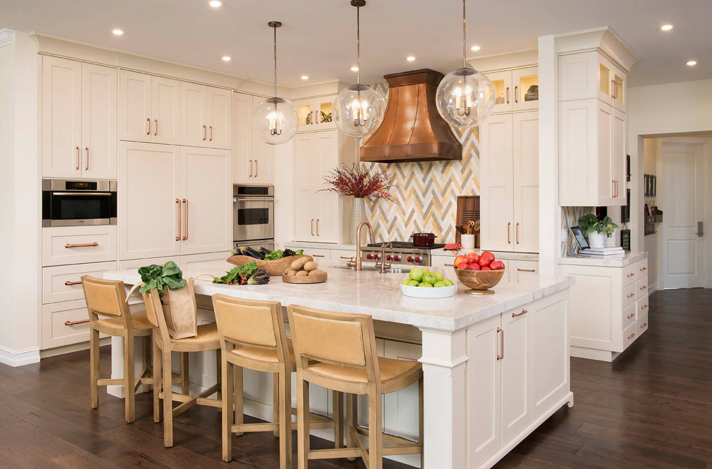 En plus des formes rectangulaires standard, la cuisine réalisera initialement des formes semi-circulaires et ovales. Ils peuvent apparaître à la fois dans les meubles, les motifs, les graphiques et la forme de la pièce elle-même. La zone de travail principale est semi-circulaire et l'îlot peut même prendre la forme d'un petit cercle.