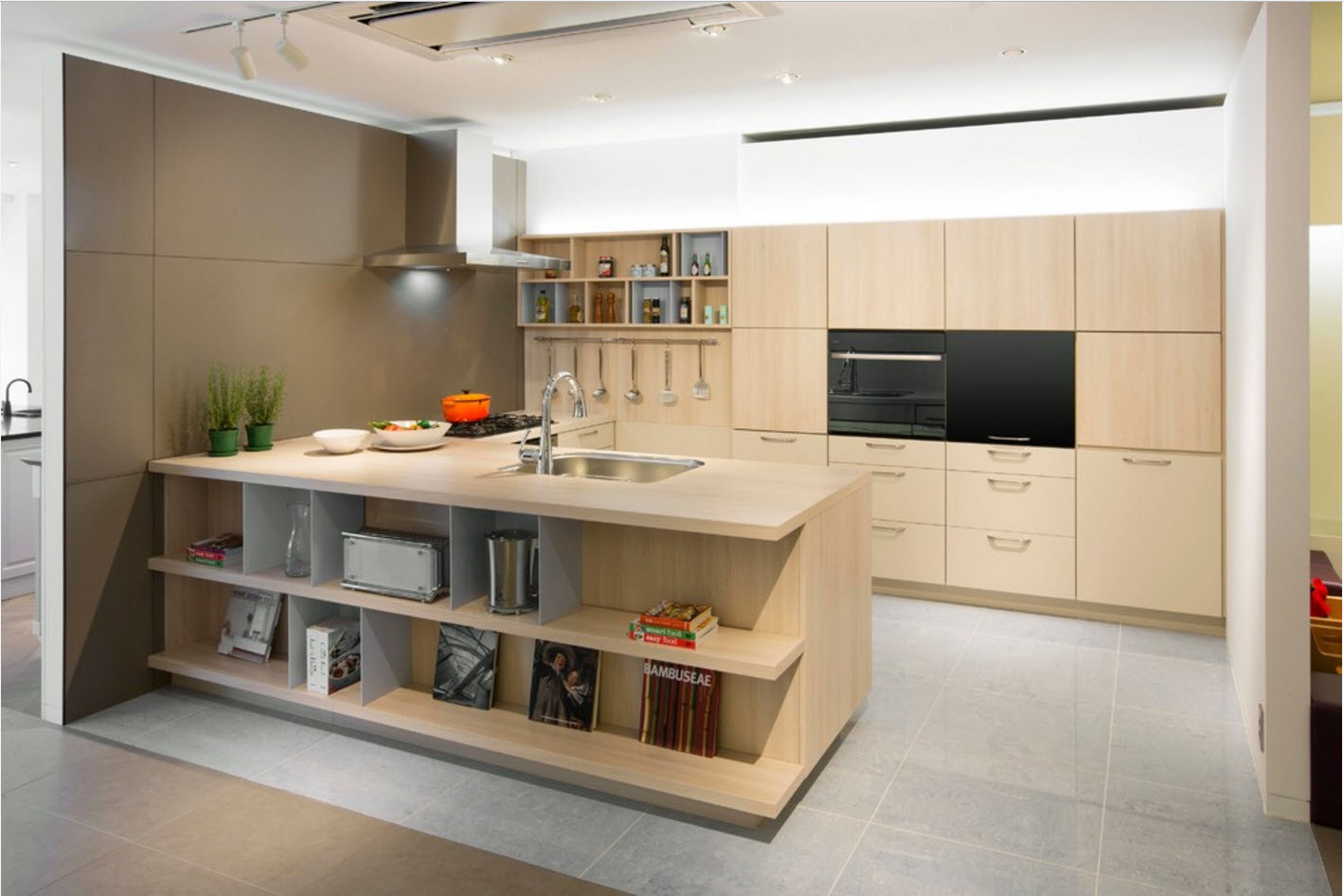 - Placement insulaire de meubles et d'un casque. Elle implique la suppression au milieu de la pièce d'une ou deux zones fonctionnelles. De telles cuisines sont technologiques, ergonomiques et originales. L'île est généralement combinée avec un bar. L'option péninsulaire est également incluse dans ce type d'hébergement.