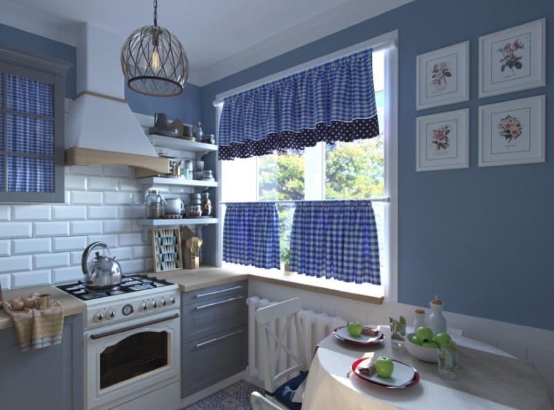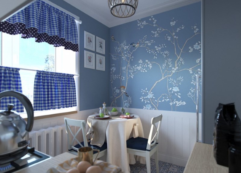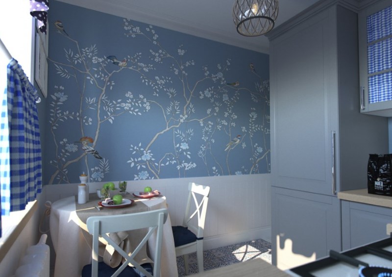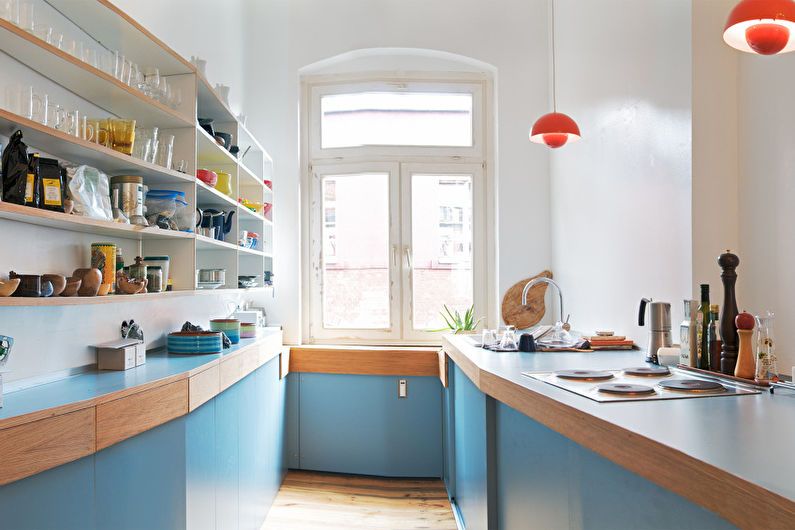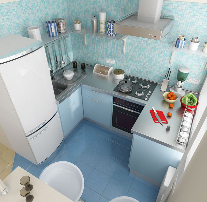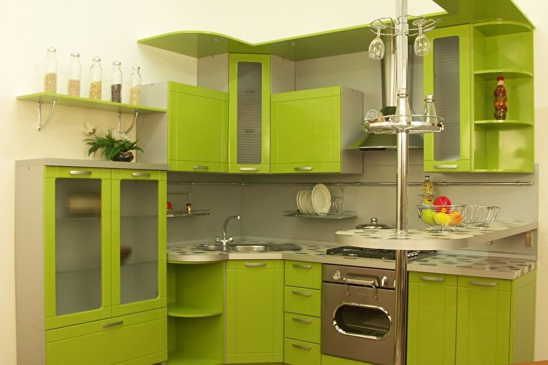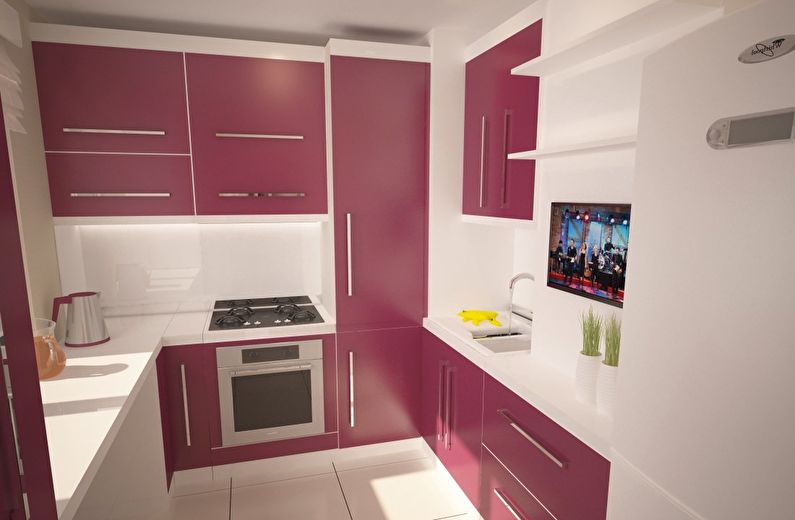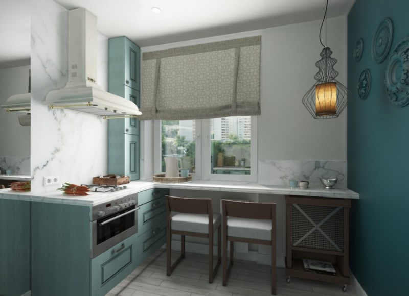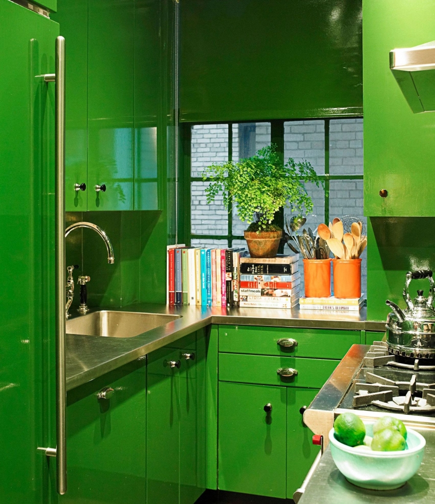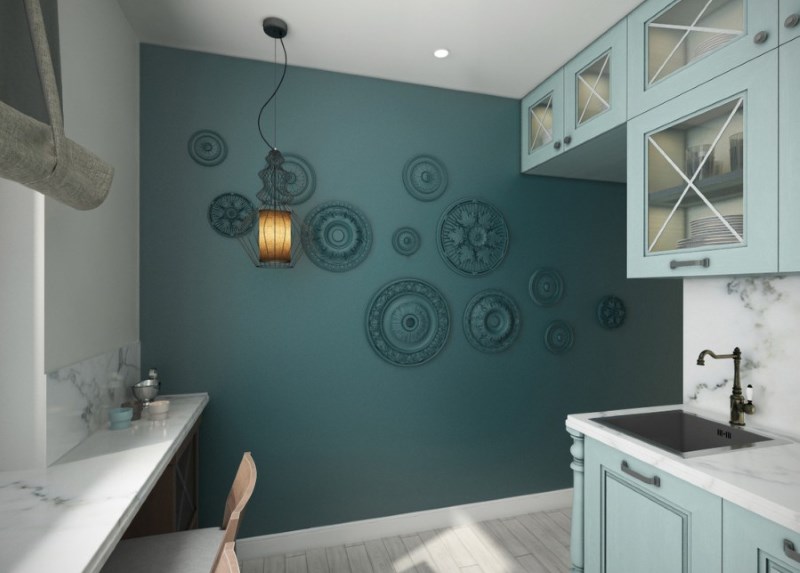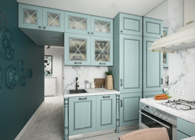 Le violet, le vert et le bleu conviennent également aux casques et autres meubles. Ils ajouteront des notes fraîches, contribuant également à donner plus de liberté à la pièce. Choisissez simplement les nuances claires de ces couleurs et votre cuisine sera fraîche et spacieuse, malgré sa taille.