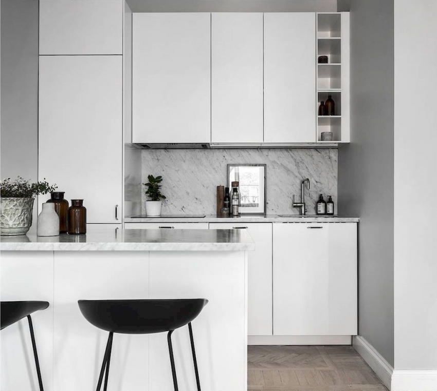 Le minimalisme suggère d'utiliser 1-2 couleurs. Ses principales couleurs sont le blanc, le gris et le beige. C'est le style le plus simple et le plus pratique. Pour le mettre en œuvre, vous devez faire plusieurs étagères ouvertes, peindre les murs dans une couleur unie et prendre un élément de cuisine blanc.