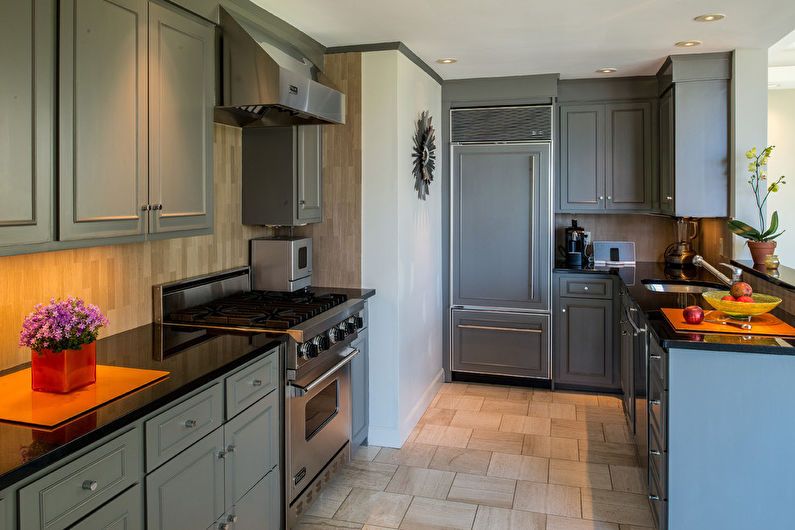 - Double rangée. Le type de mise en page a un nom parlant. Il est similaire au précédent, mais dans ce cas, l'ensemble de cuisine et les appareils sont disposés en deux rangées l'un contre l'autre, laissant le passage entre eux complètement libre. Ce type est rarement utilisé.
