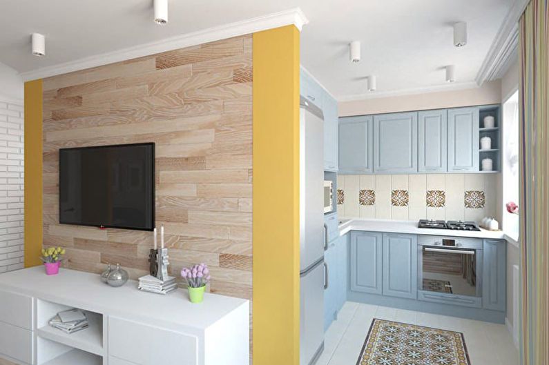 - Linéaire Idéal pour ce cas, car ici, le rapport longueur / largeur est de 3x2. Dans cette situation, les deux murs sont beaucoup plus longs que les autres, ce qui vous permet de placer la cuisine sur une seule ligne, et près de l'autre long mur pour faire un coin repas.