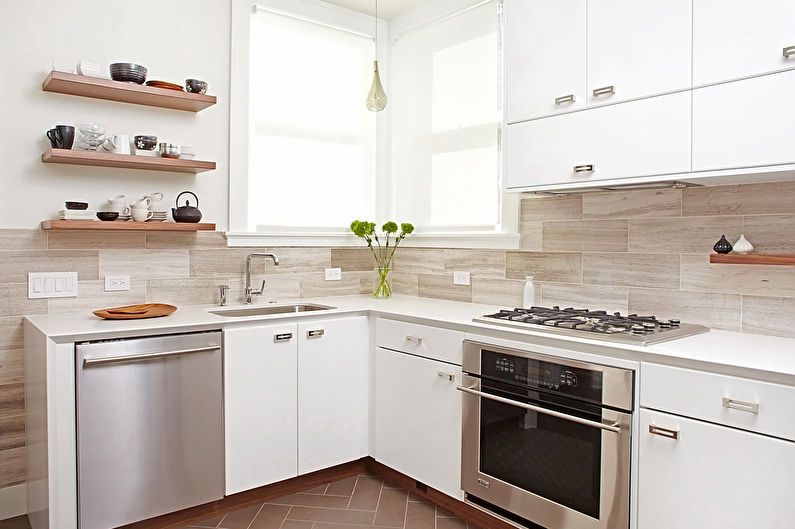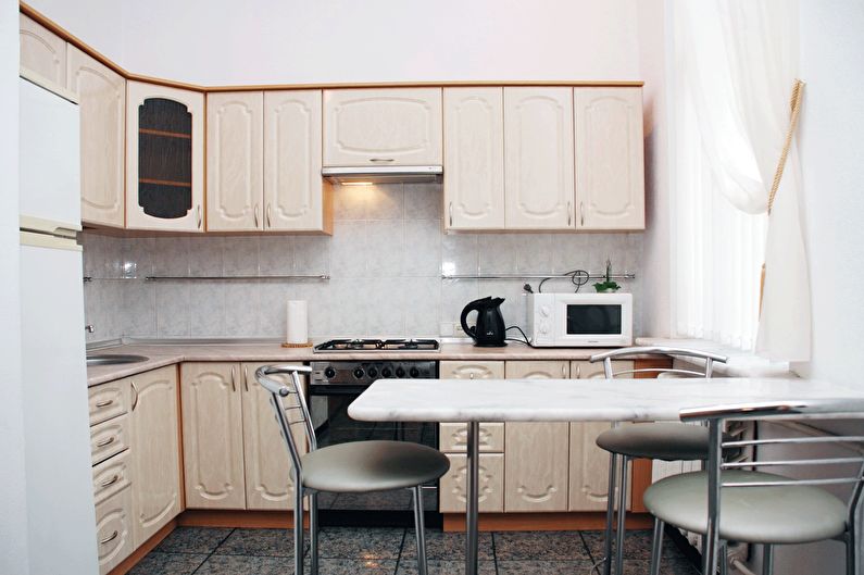 Pour le sol, choisissez un carreau léger qui, lorsqu'il est mouillé, ne devient pas trop glissant. Le linoléum est également une bonne option. Il est facile à entretenir et à utiliser. Les stratifiés et les parquets pour la cuisine ne conviennent pas, car ils nécessitent un mode d'utilisation spécial et peuvent rapidement devenir inutilisables dans cette pièce.