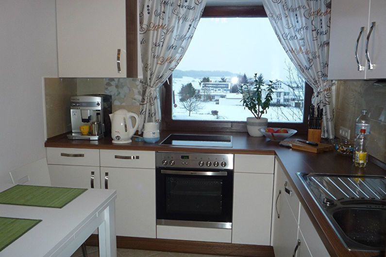 - En forme de U. Dans ce cas, il est pratique d'utiliser l'espace fenêtre. Pour ce faire, vous devez faire un appui de table et l'utiliser comme surface de travail. Ensuite, l'évier, le poêle et une autre surface de travail peuvent être placés des deux côtés du rebord de la table. Cela économise beaucoup d'espace et une salle à manger bien équipée.