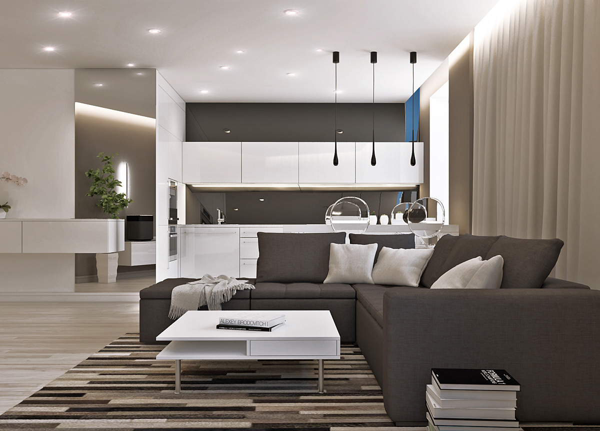 Une cuisine high-tech est construite sur des combinaisons contrastées, pour les murs gris, vous pouvez choisir un canapé blanc