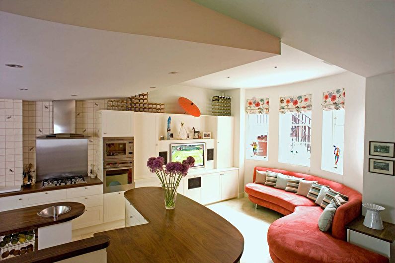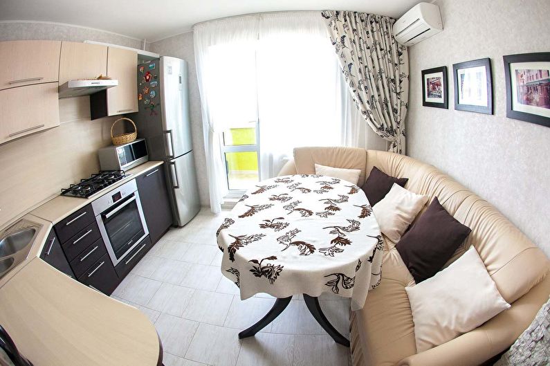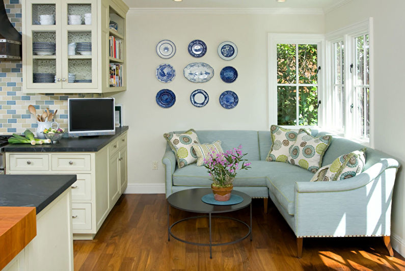 La petite surface de l'appartement oblige ses propriétaires à combiner plusieurs zones fonctionnelles dans une seule pièce à la fois. Parfois, en raison du manque d'espace, vous devez organiser un lit d'appoint directement dans la cuisine. Un canapé est idéal pour cela. Un petit canapé moelleux pendant la journée vous permet de passer confortablement du temps au dîner avec toute la famille, le soir il se transforme en lit double.