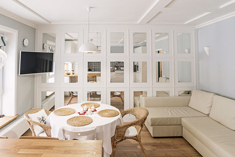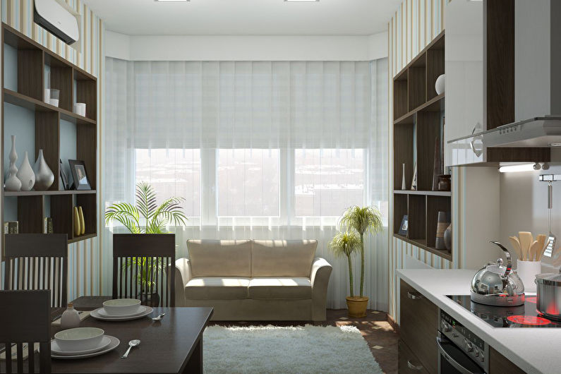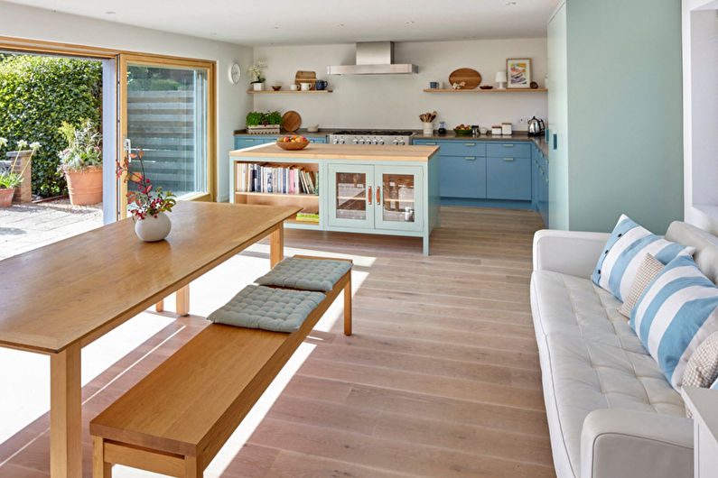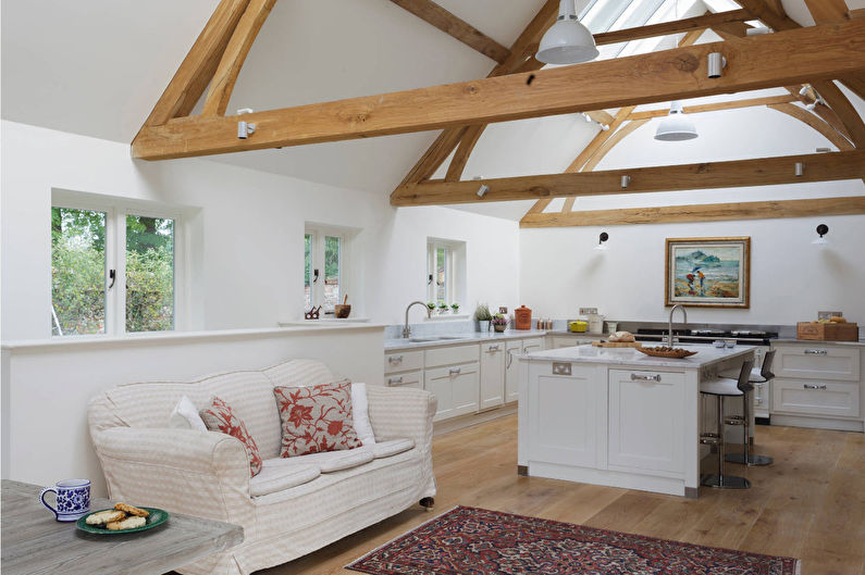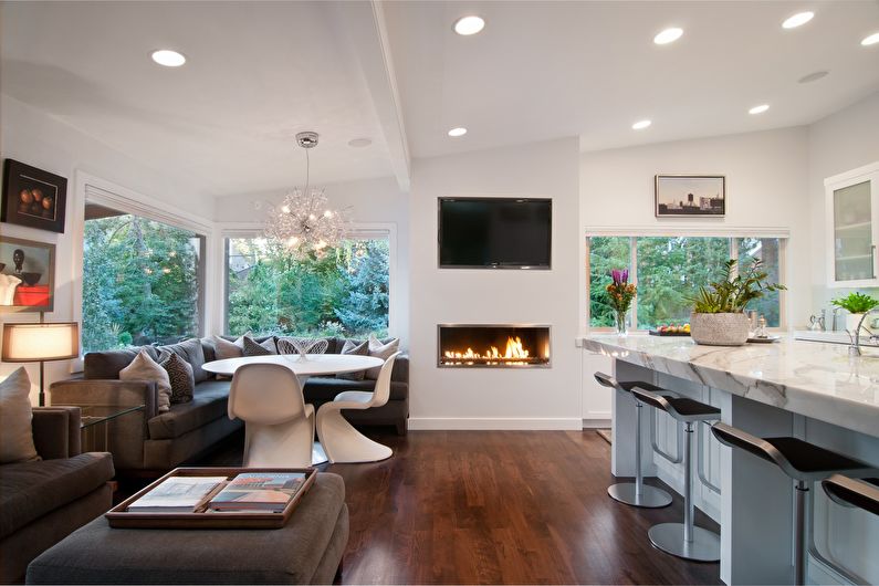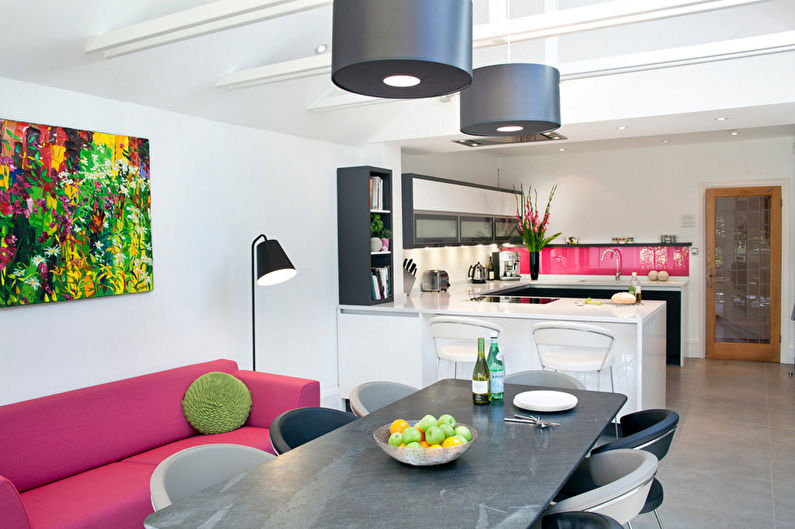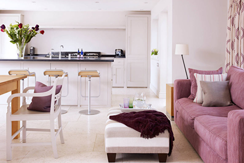 - Esthétique. L'intérieur de la cuisine, combiné au salon, doit être soigné. Une esthétique élevée doit être montrée dans les moindres détails. Dans cette salle, vous devrez rencontrer des invités, nourrir de délicieux plats, les laisser pour la nuit.