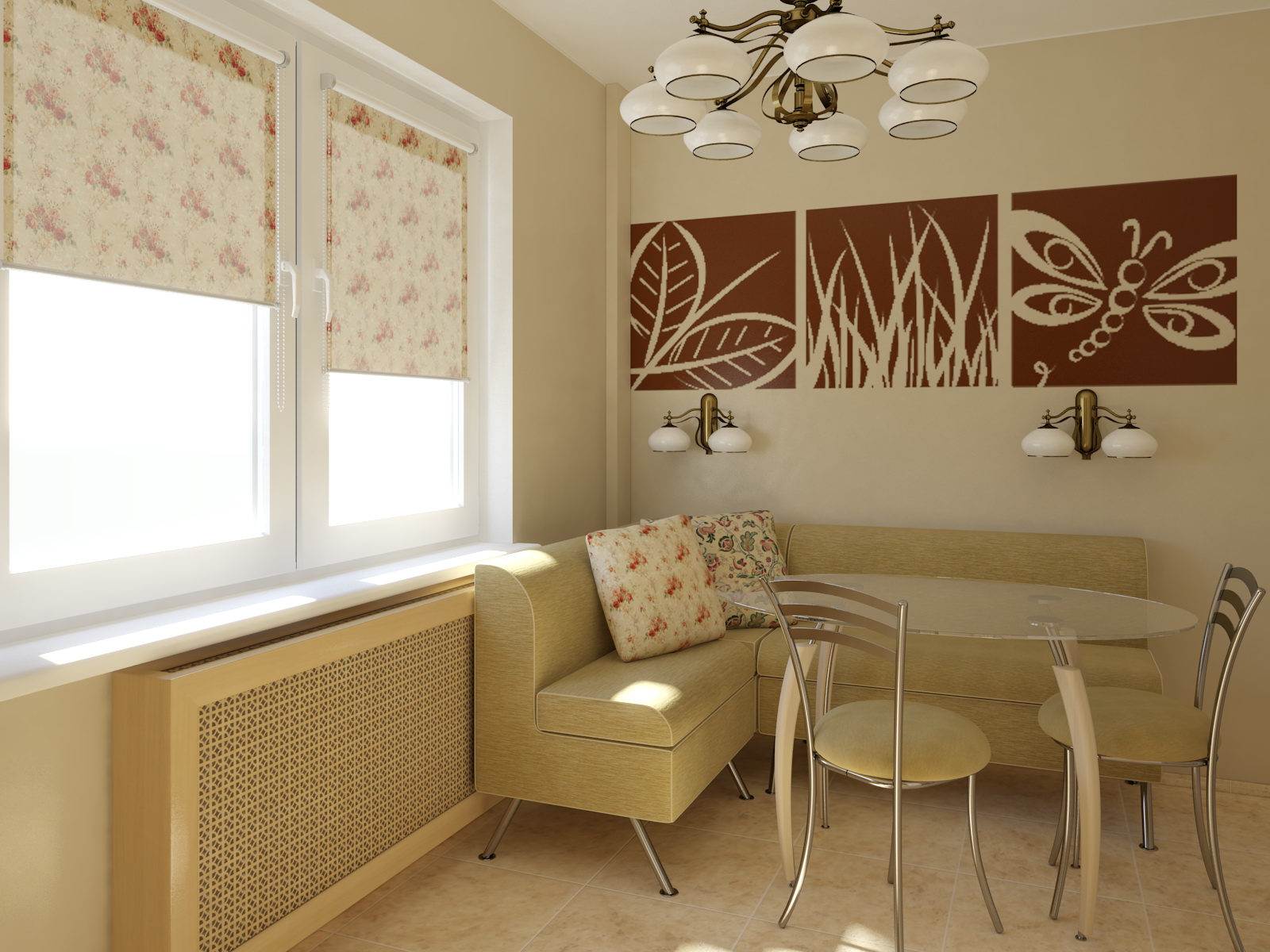 Il ne suffit pas de mettre un beau canapé dans la cuisine pour créer une atmosphère attrayante et confortable. Des décorations supplémentaires aideront à rendre l'intérieur original. Vous pouvez distinguer qualitativement une zone de loisirs avec un papier peint inhabituel. Les peintures murales sont peu coûteuses, elles sont faciles à coller vous-même sur le mur. L'image du papier peint peut être différente: abstrait, paysage. L'essentiel est qu'il devrait mettre en place une personne pour se détendre, ne pas avoir trop de petits détails. Les petits dessins distraient, gêneront le repos. Les peintures murales attireront l'attention, cacheront la zone de travail.