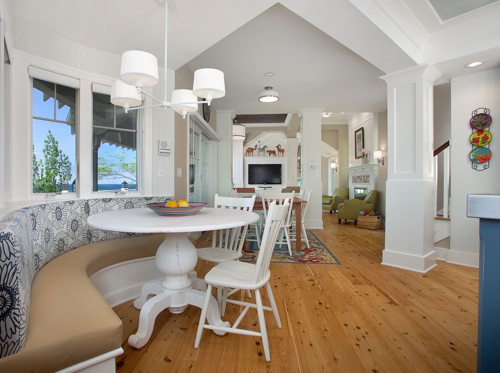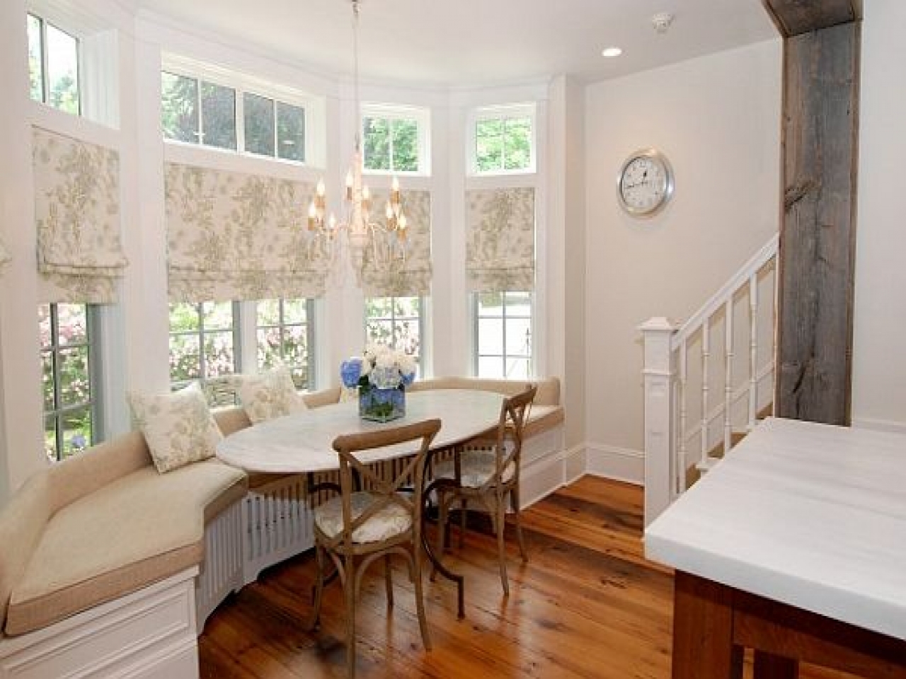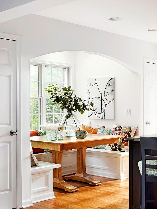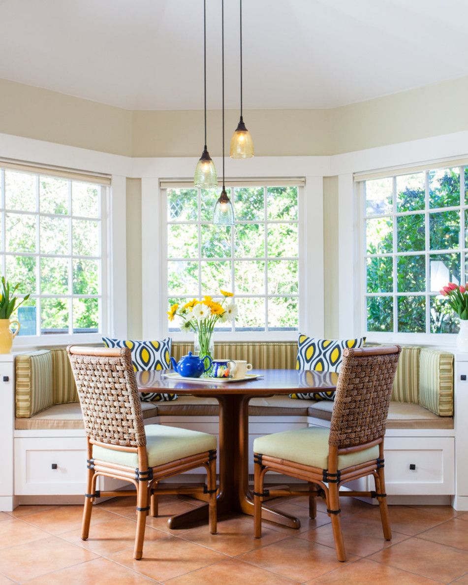 - Un canapé de cuisine moelleux devrait s'intégrer de manière optimale dans la baie vitrée. Au lieu de cela, il peut y avoir un rebord de fenêtre bas et large avec des oreillers.