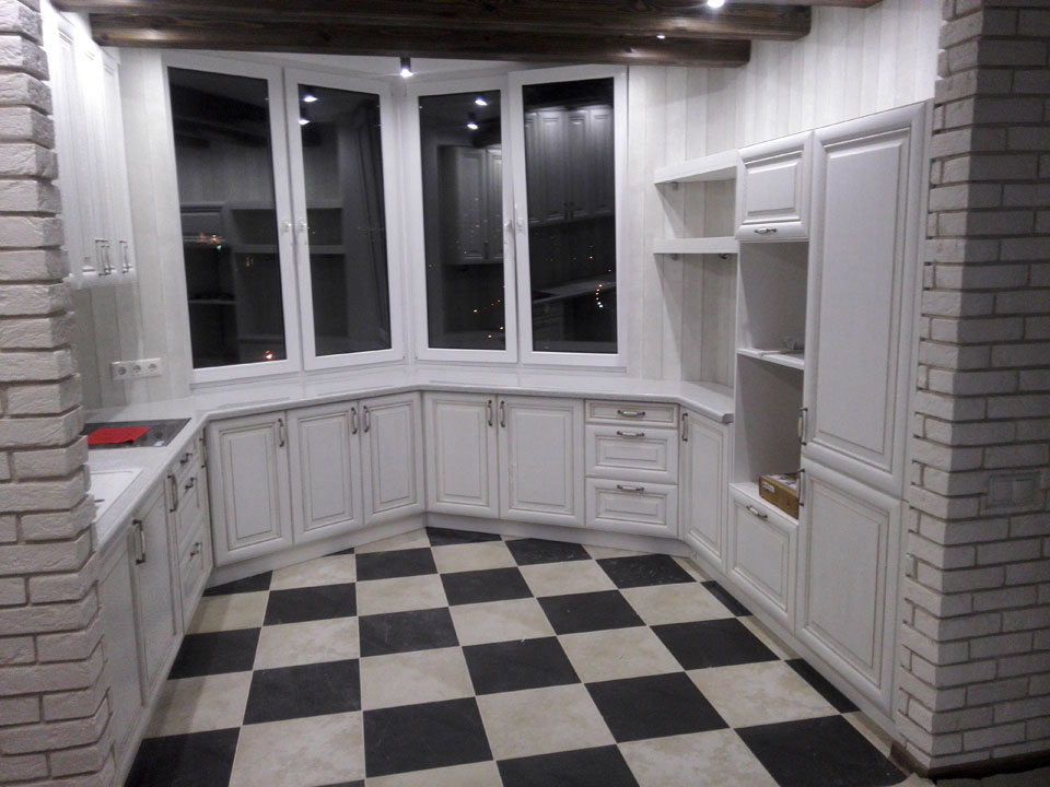 Dans celui-ci, vous pouvez aménager un endroit idéal pour la zone de travail, faisant du rebord de la fenêtre une sorte de continuation du comptoir. C'est pratique, car il y a beaucoup d'espace de travail et l'hôtesse n'aura pas besoin d'allumer la lumière artificielle pendant la majeure partie de la journée. Si vous y mettez un évier encastré, vous pourrez observer la vue depuis la fenêtre tout en lavant la vaisselle. Un petit problème dans ce cas n'est que l'approvisionnement en eau et son évacuation.
