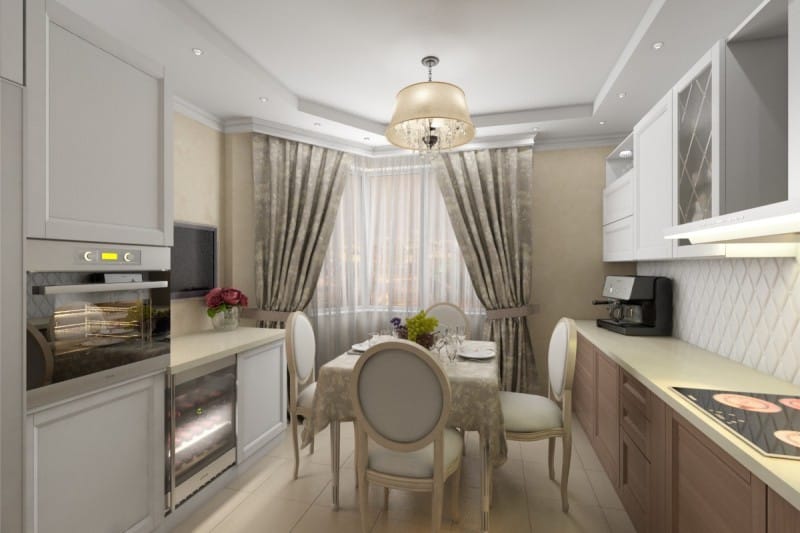 La conception de la cuisine avec une baie vitrée P-44T, d'une superficie de 13 mètres, est très pertinente pour les propriétaires d'appartements dans des immeubles à plusieurs étages, qu'ils ont commencé à construire en 1979. Ces pièces se caractérisent par de hauts plafonds - jusqu'à 2,75 mètres, des cuisines relativement grandes - jusqu'à 13 mètres, avec une baie vitrée, le plus souvent en forme de trapèze.